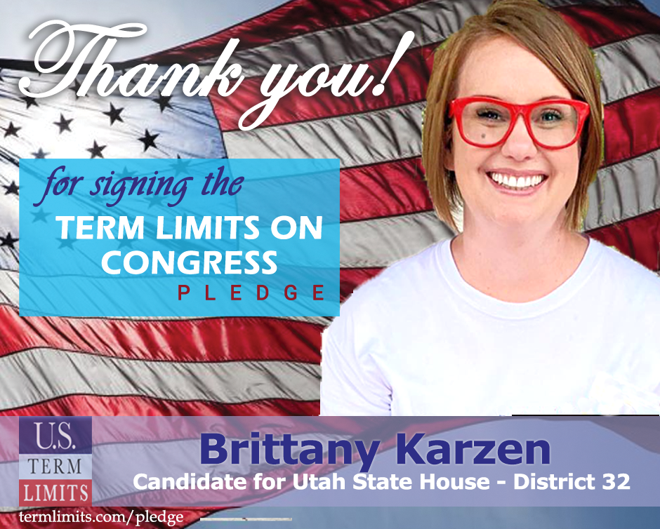 West Valley City, UT – U.S. Term Limits (USTL), the leader in the national, non-partisan movement to limit terms for elected officials, is gathering support from state lawmakers across the nation. Its mission is to get 34 states to apply for an amendment proposal convention specific to term limits on Congress. Utah state house candidate, Brittany Karzen (district 32) has committed support for term limits on Congress by signing the Term Limits Convention pledge. Previously, candidate Sahara Hayes also signed the pledge.