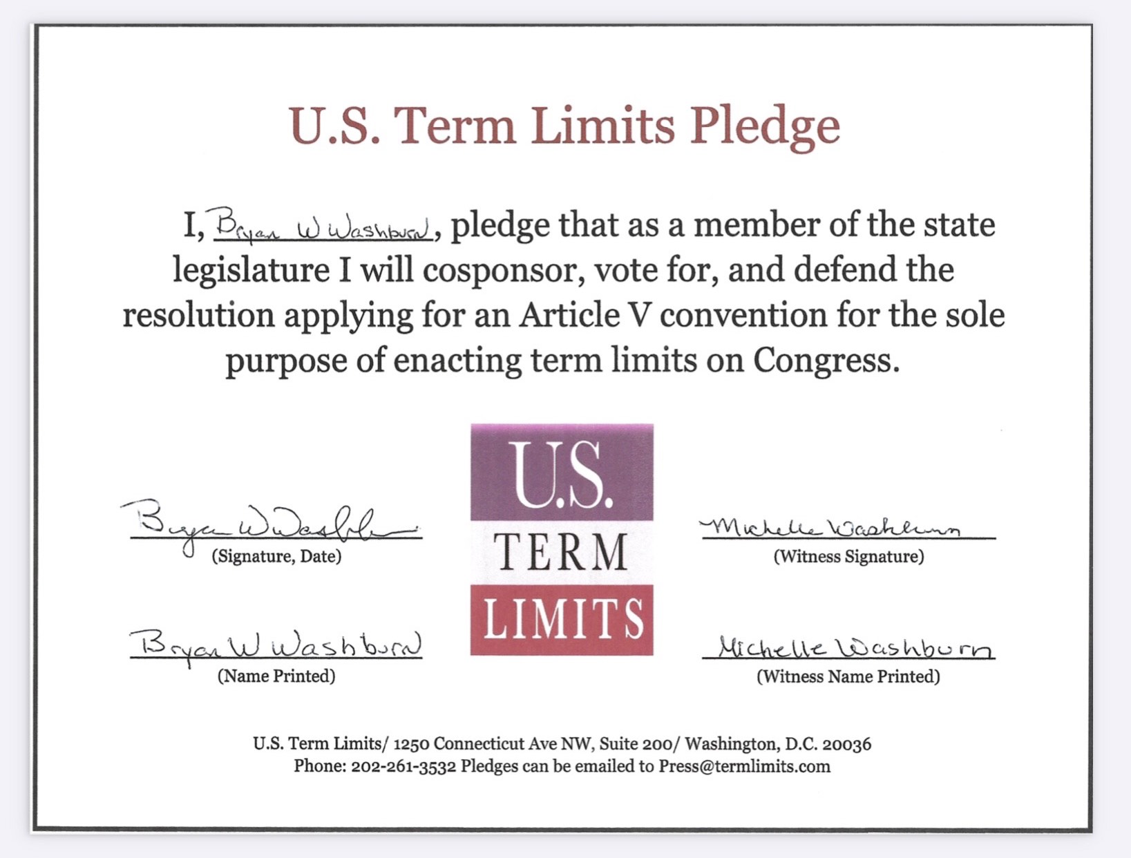Bryan Washburn Pledges to Support Congressional Term Limits