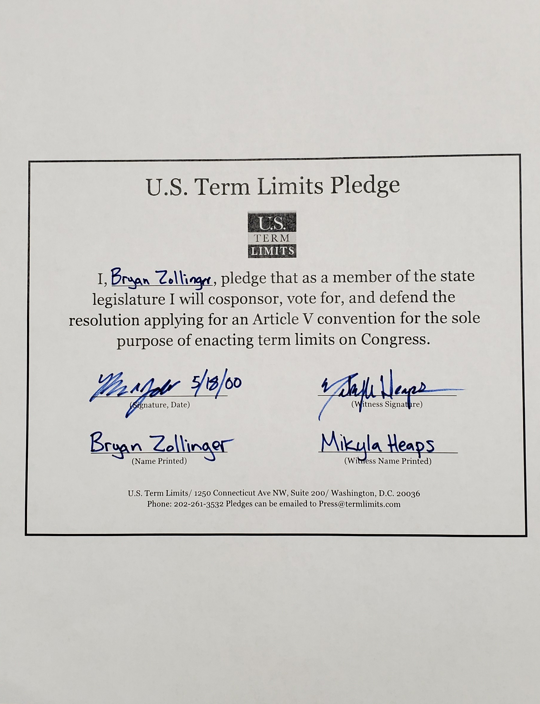Rep. Bryan Zollinger Pledges to Support Congressional Term Limits