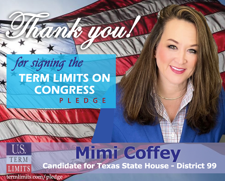 The U.S. Term Limits amendment pledge is provided to every announced candidate for federal office. It reads, “I pledge that as a member of Congress, I will cosponsor and vote for the U.S. Term Limits amendment of three (3) House terms and two (2) Senate terms and no longer limit.” The U.S. Term Limits constitutional amendment has been introduced in both the U.S. Senate by Senator Ted Cruz (SJR1) and the U.S. House by Representative Francis Rooney (HJR20).
