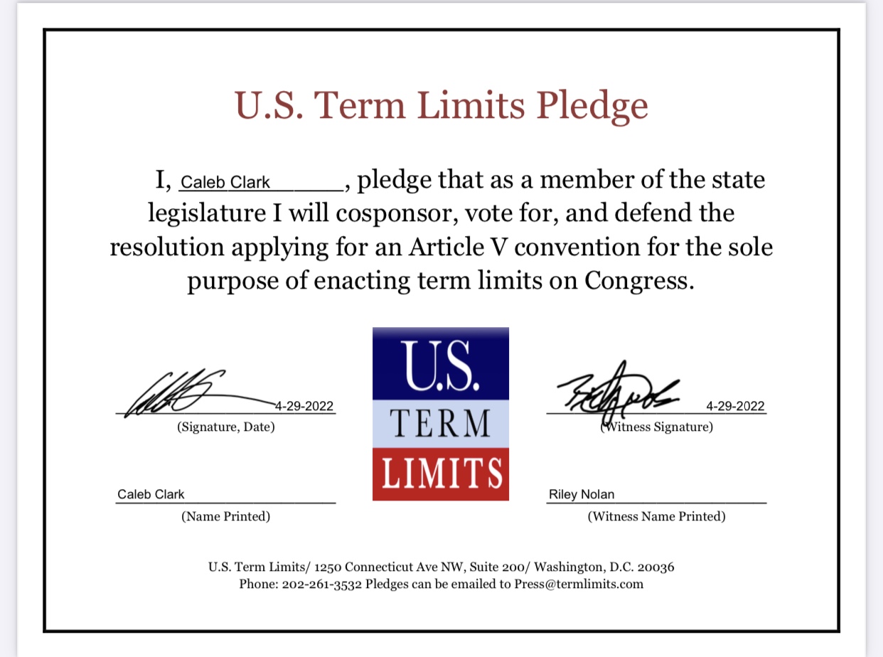 Eugene, OR – U.S. Term Limits (USTL), the leader in the national, non-partisan movement to limit terms for elected officials, is gathering support from state lawmakers across the nation. Its mission is to get 34 states to apply for an amendment proposal convention specific to term limits on Congress. Oregon state house candidate, Caleb Clark (district 14) has committed support for term limits on Congress by signing the Term Limits Convention pledge. Clark is the first signer in this race.