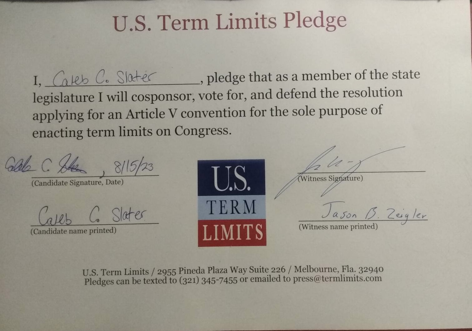 USTL President, Philip Blumel, commented on Slater’s pledge saying, “Caleb’s strong support of term limits shows that there are individuals who are willing to listen to the majority of voters who want term limits. America needs a Congress that will be served by citizen legislators, not career politicians.”