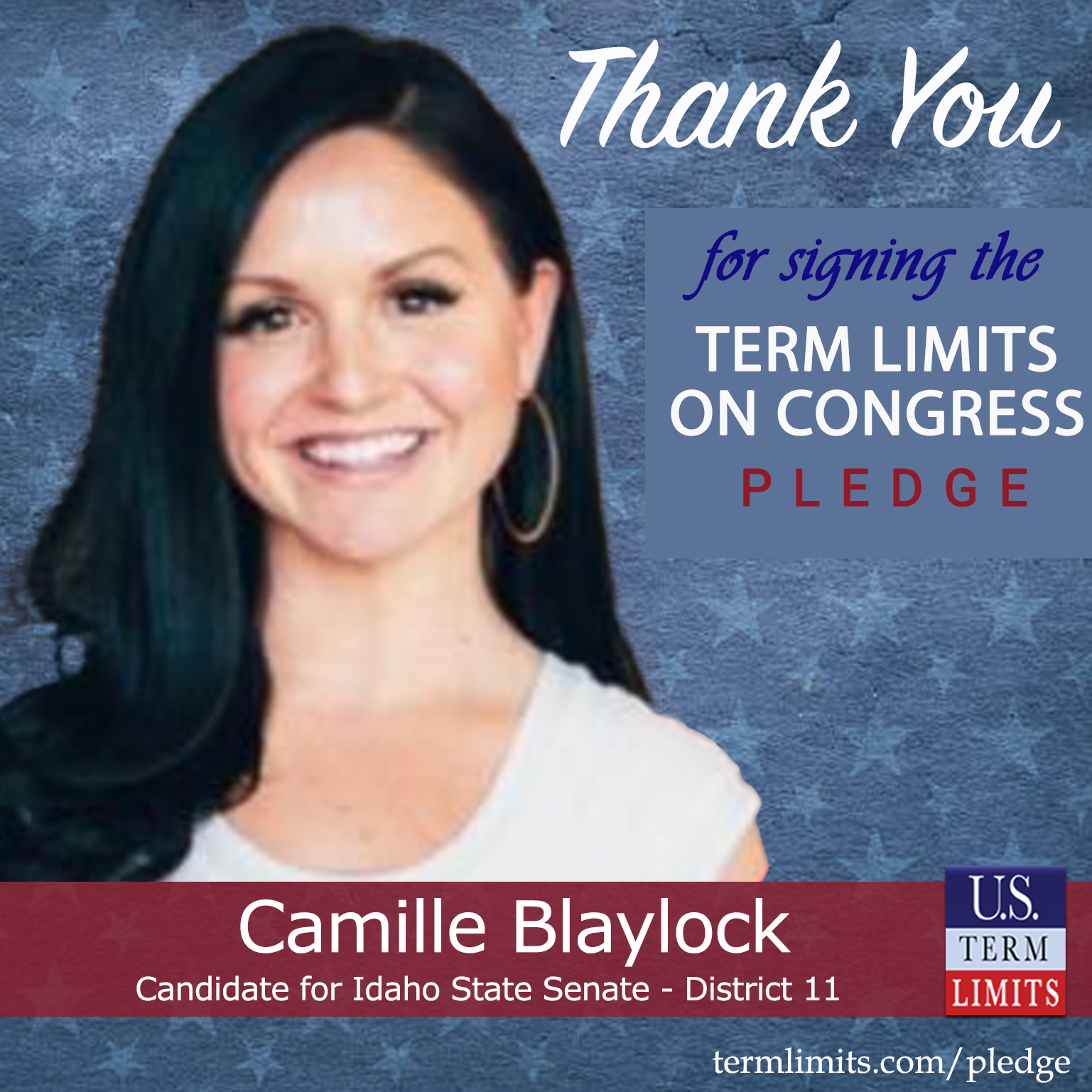 Caldwell, ID – U.S. Term Limits (USTL), the leader in the national, non-partisan movement to limit terms for elected officials, is gathering support from state lawmakers across the nation. Its mission is to get 34 states to apply for an amendment proposal convention specific to term limits on Congress. Idaho state senate candidate, Camille Blaylock (District 11), has committed support for term limits on Congress by signing the term limits convention pledge. Blaylock is the first signer in this race.
