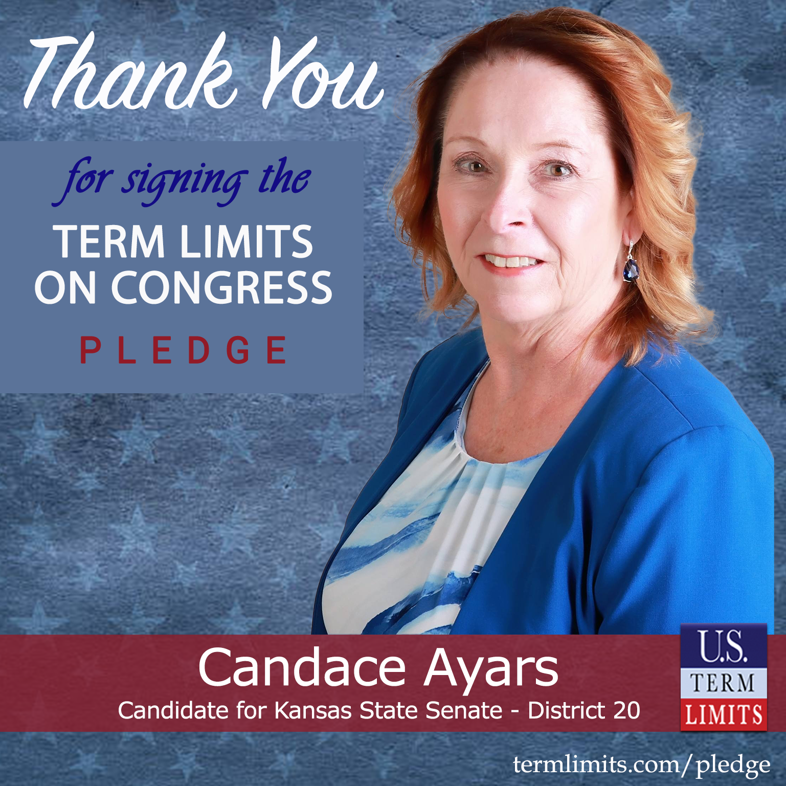 Topeka, KS – U.S. Term Limits (USTL), the leader in the national, non-partisan movement to limit terms for elected officials, is gathering support from state lawmakers across the nation. Its mission is to get 34 states to apply for an amendment proposal convention specific to term limits on Congress. Kansas state senate candidate, Candace Ayars (district 20), has committed support for term limits on Congress by signing the term limits convention pledge.