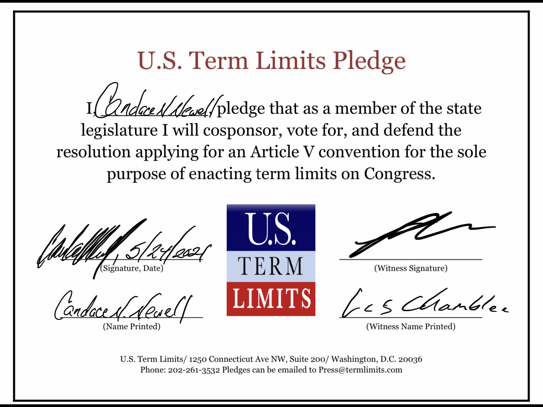 USTL President, Philip Blumel, commented on Newell’s pledge saying, “Candace’s support of term limits shows that there are individuals who are willing to listen to the majority of voters who want term limits. America needs a Congress that will be served by citizen legislators, not career politicians.”