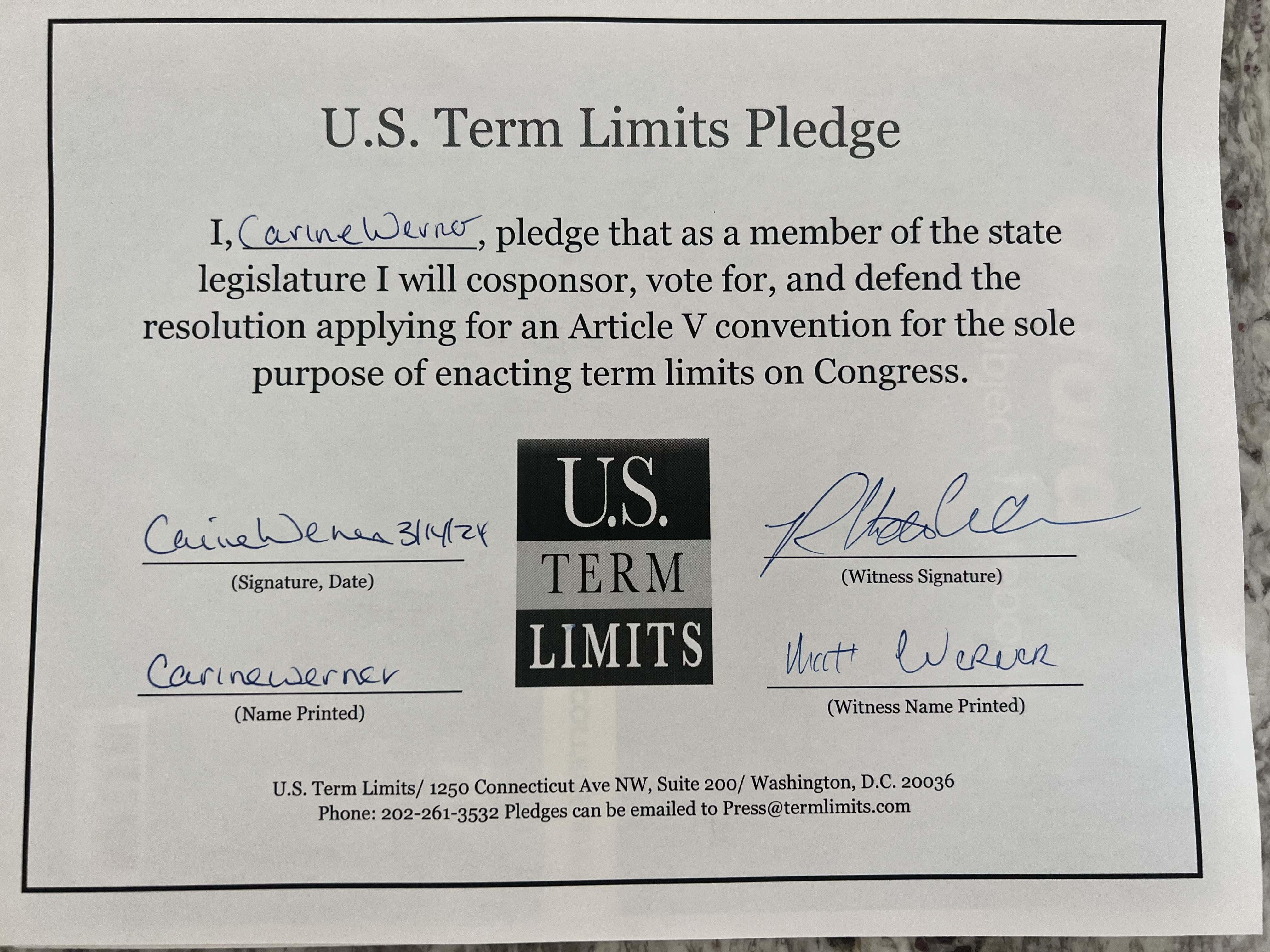 Carine Werner Pledges to Support Congressional Term Limits