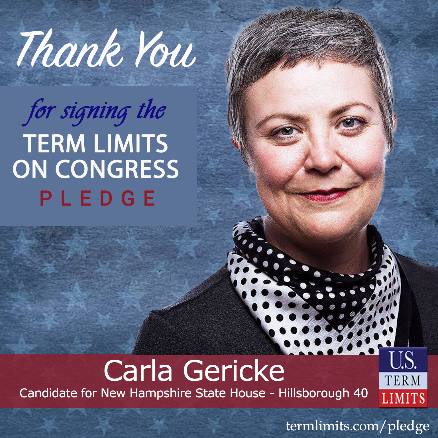 Manchester, NH – U.S. Term Limits (USTL), the leader in the national, non-partisan movement to limit terms for elected officials, is gathering support from state lawmakers across the nation. Its mission is to get 34 states to apply for an amendment proposal convention specific to term limits on Congress. New Hampshire state house candidate, Carla Gericke (Hillsborough 40), has committed support for term limits on Congress by signing the term limits convention pledge.