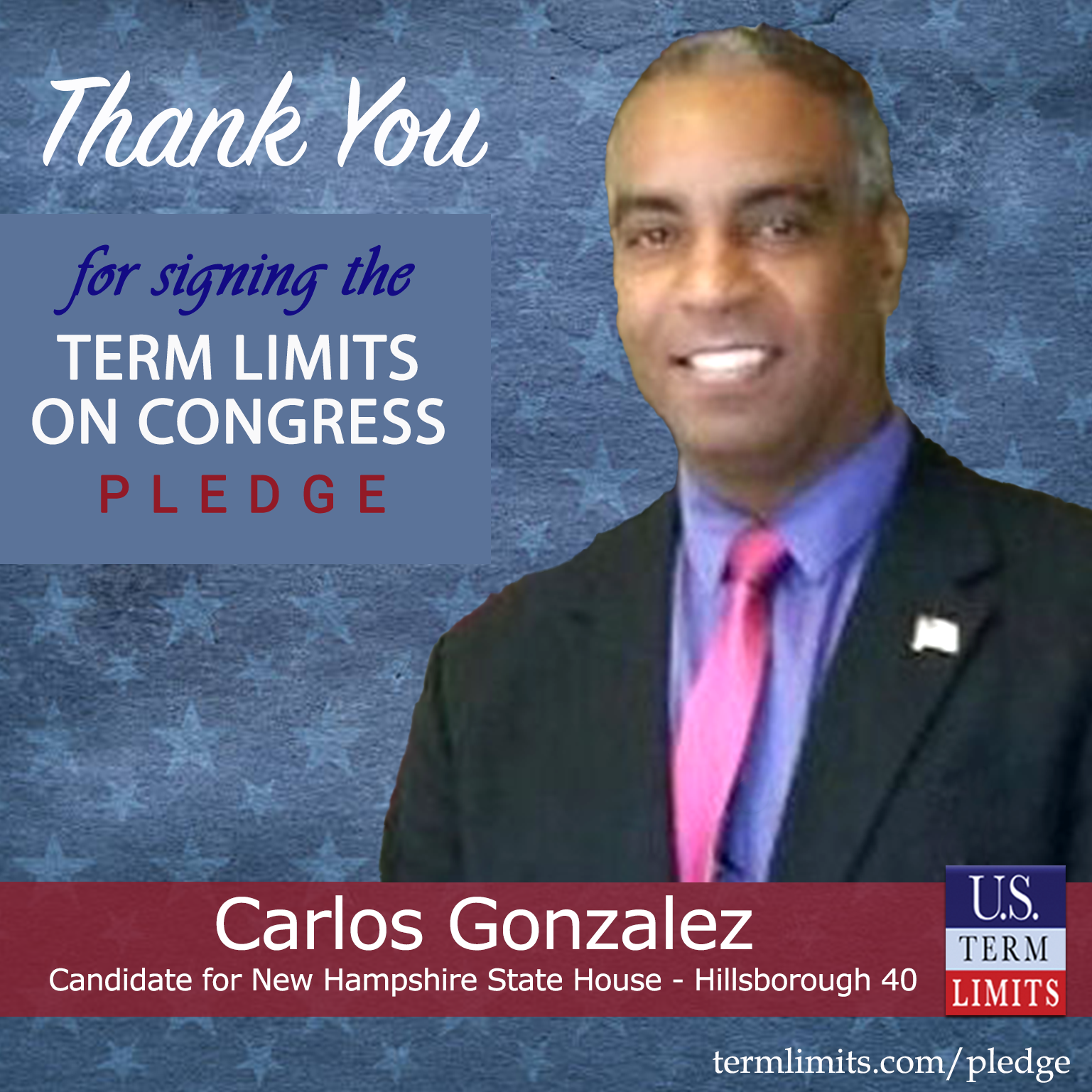 Manchester, NH – U.S. Term Limits (USTL), the leader in the national, non-partisan movement to limit terms for elected officials, is gathering support from state lawmakers across the nation. Its mission is to get 34 states to apply for an amendment proposal convention specific to term limits on Congress. New Hampshire state house candidate, Carlos Gonzalez (Hillsborough 40), has committed support for term limits on Congress by signing the term limits convention pledge. Previously, candidate Carla Gericke also signed the pledge.