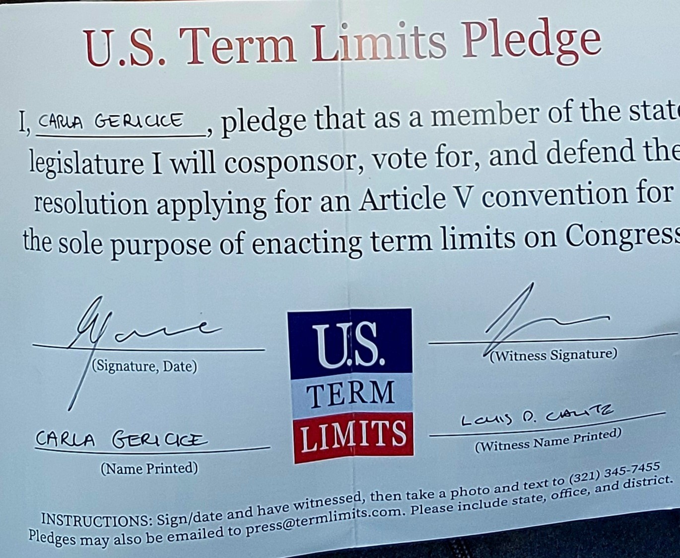 The U.S. Term Limits pledge is provided to candidates and members of state legislatures. It reads, “I pledge that, as a member of the state legislature, I will cosponsor, vote for, and defend the resolution applying for an Article V convention for the sole purpose of enacting term limits on Congress.”