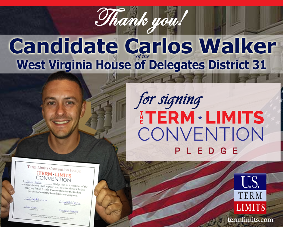 Washington, D.C. – U.S. Term Limits (USTL), the leader in the national, non-partisan movement to limit terms for elected officials, is gathering support from state lawmakers across the nation. Its mission is to get 34 states to apply for an amendment proposal convention specific to term limits on Congress. West Virginia state house of delegates candidate Carlos Walker, district 31, has committed support for term limits on Congress by signing the Term Limits Convention pledge.