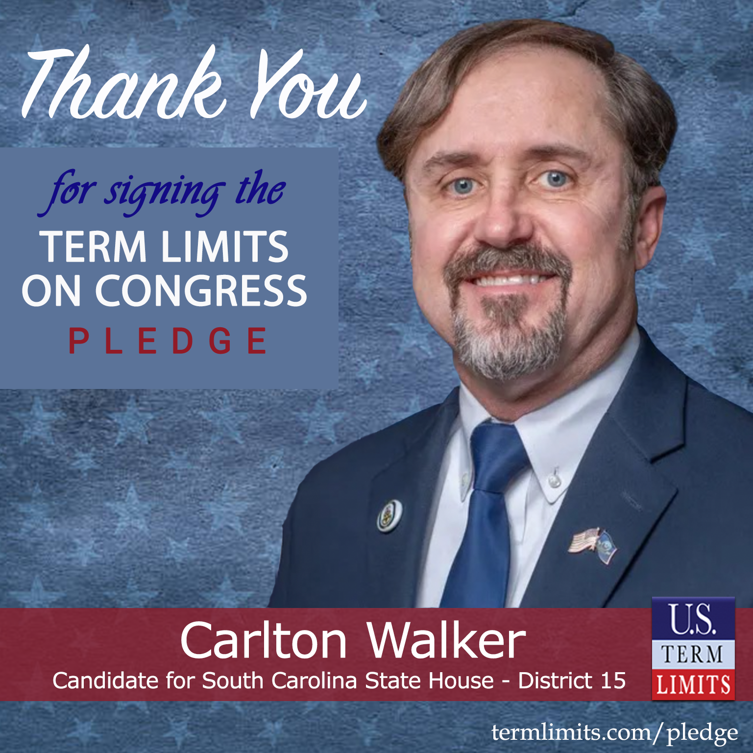 “Term limits are important for the future of our nation. I am glad that Carlson Walker is willing to sign the candidate pledge and recognizes the positive impact term limits will have on our country”, says John Warren, USTL State Chair for South Carolina.”