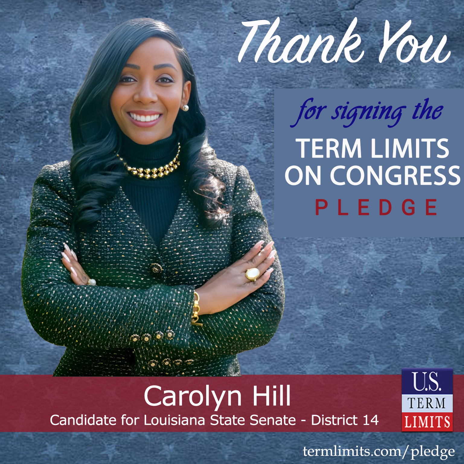 Baton Rouge, LA – U.S. Term Limits (USTL), the leader in the national, non-partisan movement to limit terms for elected officials, is gathering support from state lawmakers across the nation. Its mission is to get 34 states to apply for an amendment proposal convention specific to term limits on Congress. 2025 Louisiana state senate candidate, Carolyn Hill (district 14), has committed support for term limits on Congress by signing the term limits convention pledge. Previously, candidate Quentin Anthony Anderson also signed the pledge. The primary special election is scheduled for February 15, 2025.
