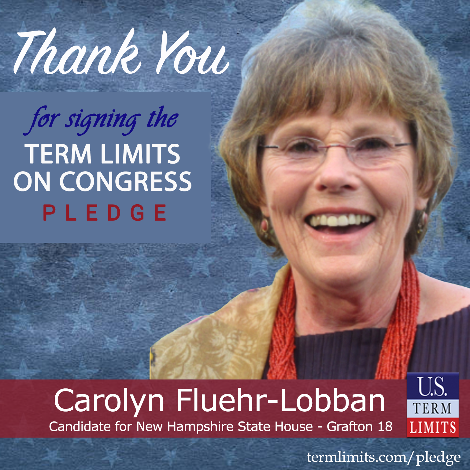Bristol, NH – U.S. Term Limits (USTL), the leader in the national, non-partisan movement to limit terms for elected officials, is gathering support from state lawmakers across the nation. Its mission is to get 34 states to apply for an amendment proposal convention specific to term limits on Congress. New Hampshire state house candidate, Carolyn Lobban (Grafton 18), has committed support for term limits on Congress by signing the term limits convention pledge.