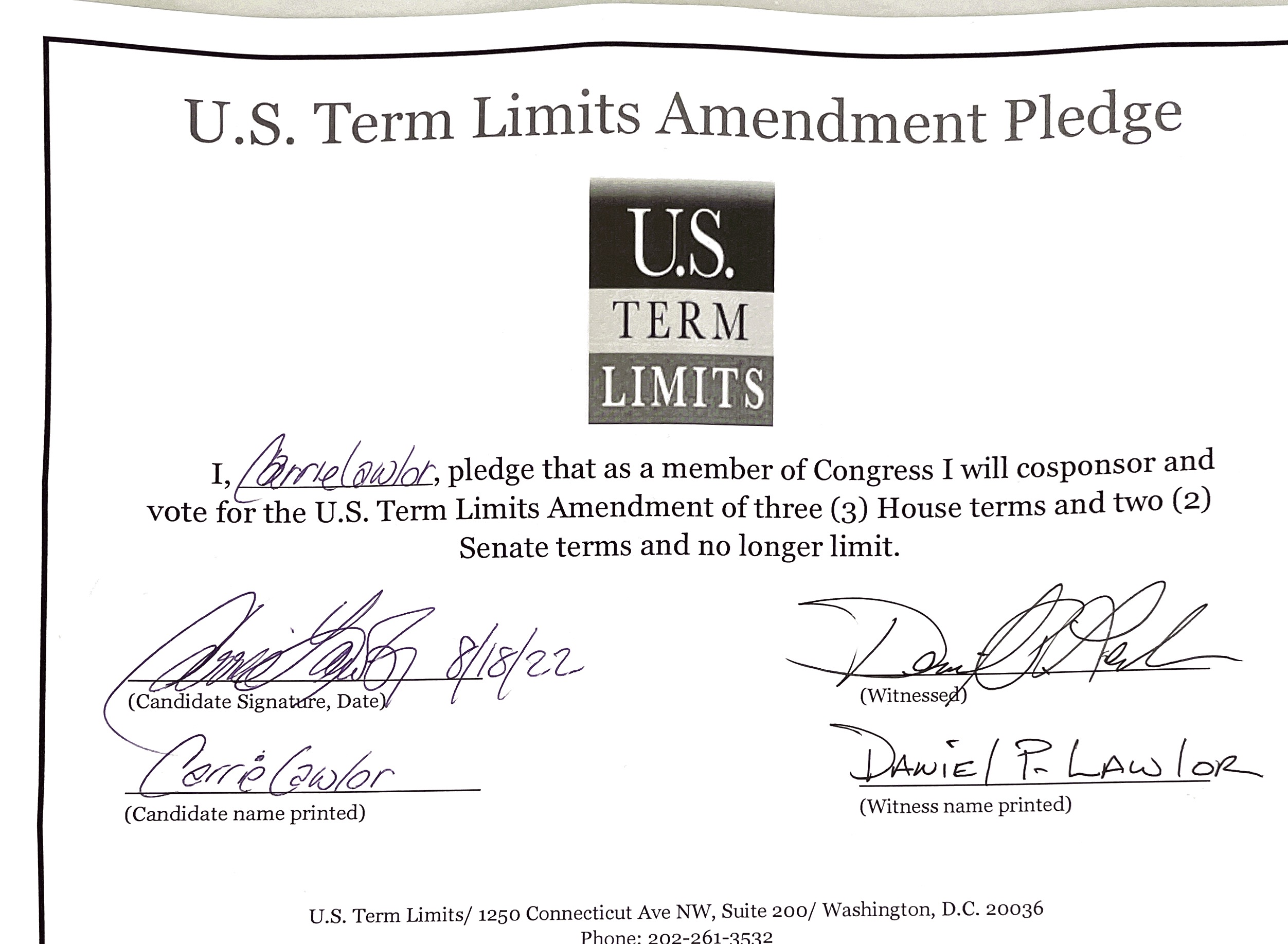 Washington D.C. – U.S. Term Limits (USTL), the leader in the non-partisan national movement to limit terms for elected officials, praises 2022 U.S. house candidate for Florida, Carrie Lawlor (district 22), for signing the pledge for an amendment to term limit Congress. Previously, candidates Peter Arianas, Deborah Adeimy, Rod Dorilas and Dan Franzese also signed the pledge. The primary election is scheduled for August 23, 2022.