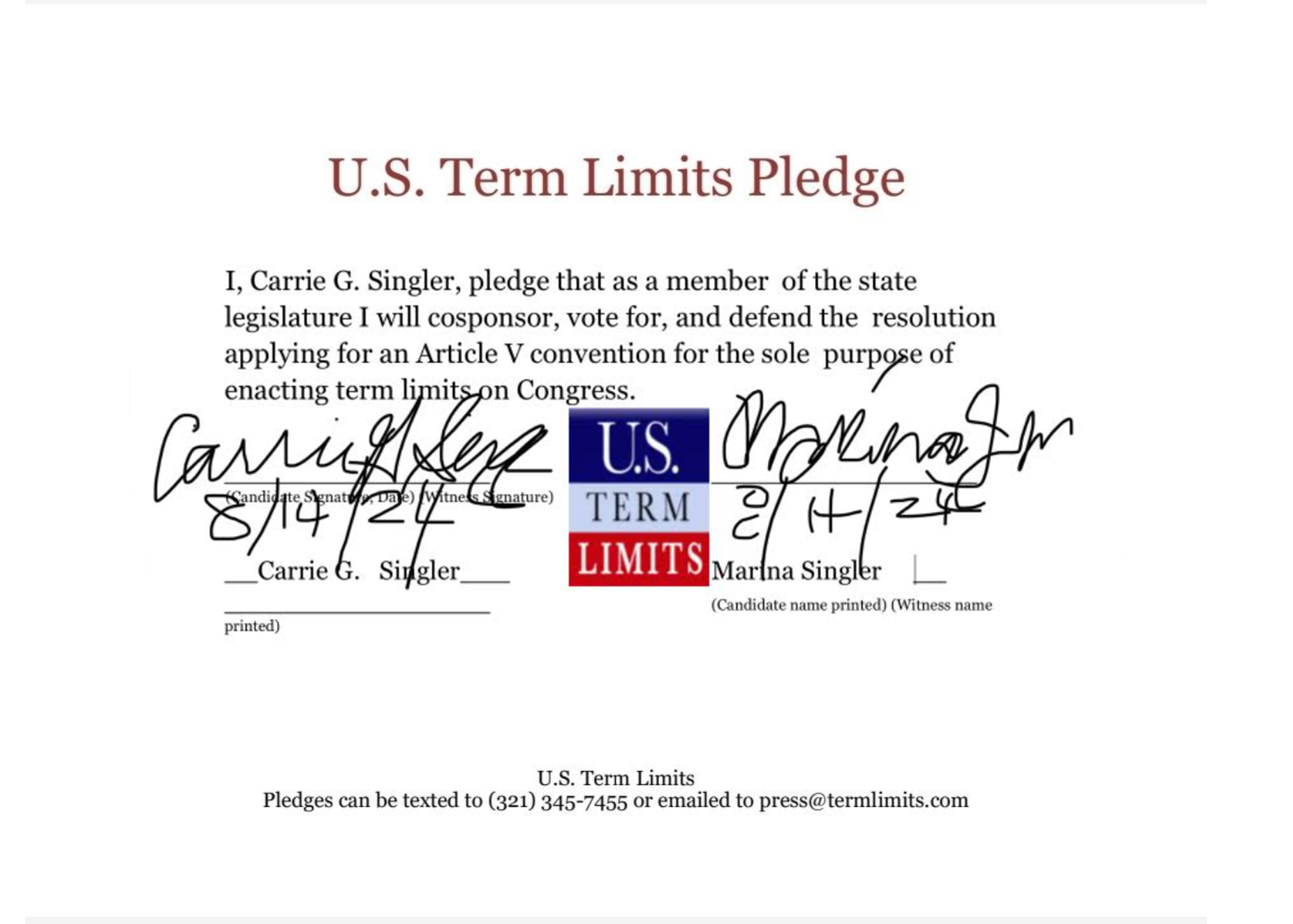 USTL President, Philip Blumel, commented on Singler’s pledge saying, “Carrie’s strong support of term limits shows that there are individuals who are willing to listen to the majority of voters who want term limits. America needs a Congress that will be served by citizen legislators, not career politicians.”