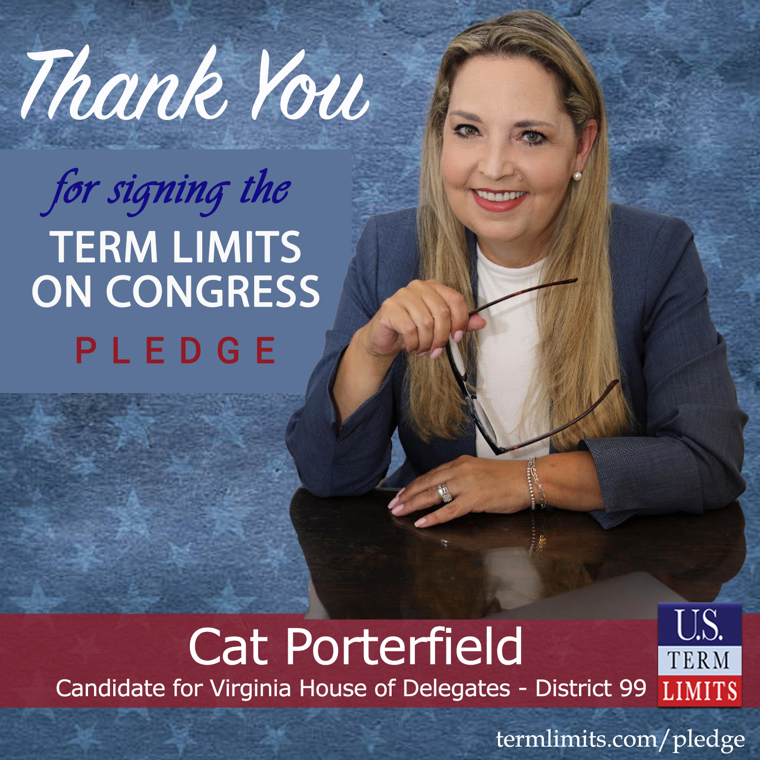 Virginia Beach, VA – U.S. Term Limits (USTL), the leader in the national, non-partisan movement to limit terms for elected officials, is gathering support from state lawmakers across the nation. Its mission is to get 34 states to apply for an amendment proposal convention specific to term limits on Congress. 2025 Virginia state house of delegates candidate, Cat Porterfield (district 99), has committed support for term limits on Congress by signing the term limits convention pledge. Porterfield is the first signer in this race.