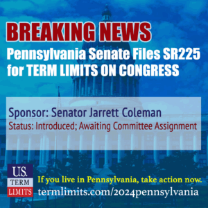 For immediate release February 2, 2024 Contact: Kenn Quinn, U.S. Term Limits Phone: 207-713-8700 kquinn@termlimits.com Pennsylvania Files Resolution to Term Limit Congress Philadelphia, PA – Pennsylvania State Senator Jarrett Coleman (District 16) has signed on as the Senate sponsor of Senate Resolution 225 (SR225). This resolution would have Pennsylvania join other states in calling for