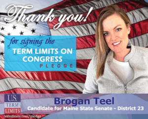 For immediate release May 19, 2022 Contact: Scott Tillman, U.S. Term Limits Phone: (321) 345-7455 stillman@termlimits.com Brogan Teel Pledges to Support Congressional Term Limits Portland, ME – U.S. Term Limits (USTL), the leader in the national, non-partisan movement to limit terms for elected officials, is gathering support from state lawmakers across the nation. Its mission