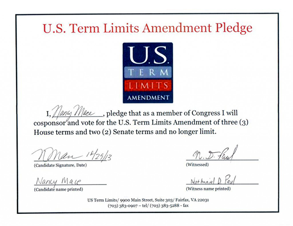 The U.S. Term Limits amendment pledge is provided to every announced candidate for federal office. It reads, “I pledge that as a member of Congress, I will cosponsor and vote for the U.S. Term Limits amendment of three (3) House terms and two (2) Senate terms and no longer limit.” The U.S. Term Limits constitutional amendment has been introduced in both the U.S. Senate by Senator Ted Cruz and his colleagues (SJR2) and the U.S. House by Representative Ralph Norman (HJR11).