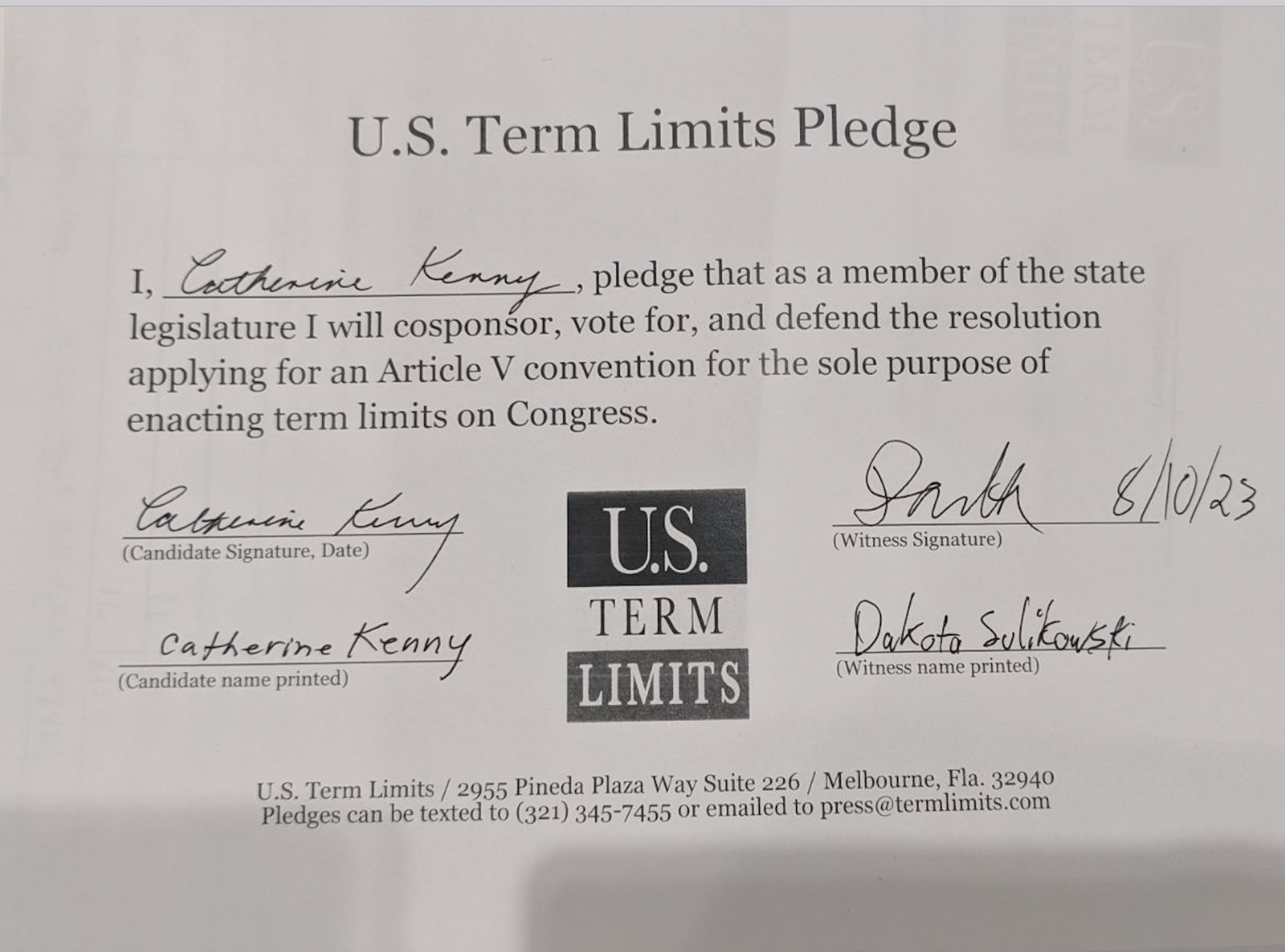 USTL President, Philip Blumel, commented on Kenny’s pledge saying, “Cathy’s strong support of term limits shows that there are individuals who are willing to listen to the majority of voters who want term limits. America needs a Congress that will be served by citizen legislators, not career politicians.”