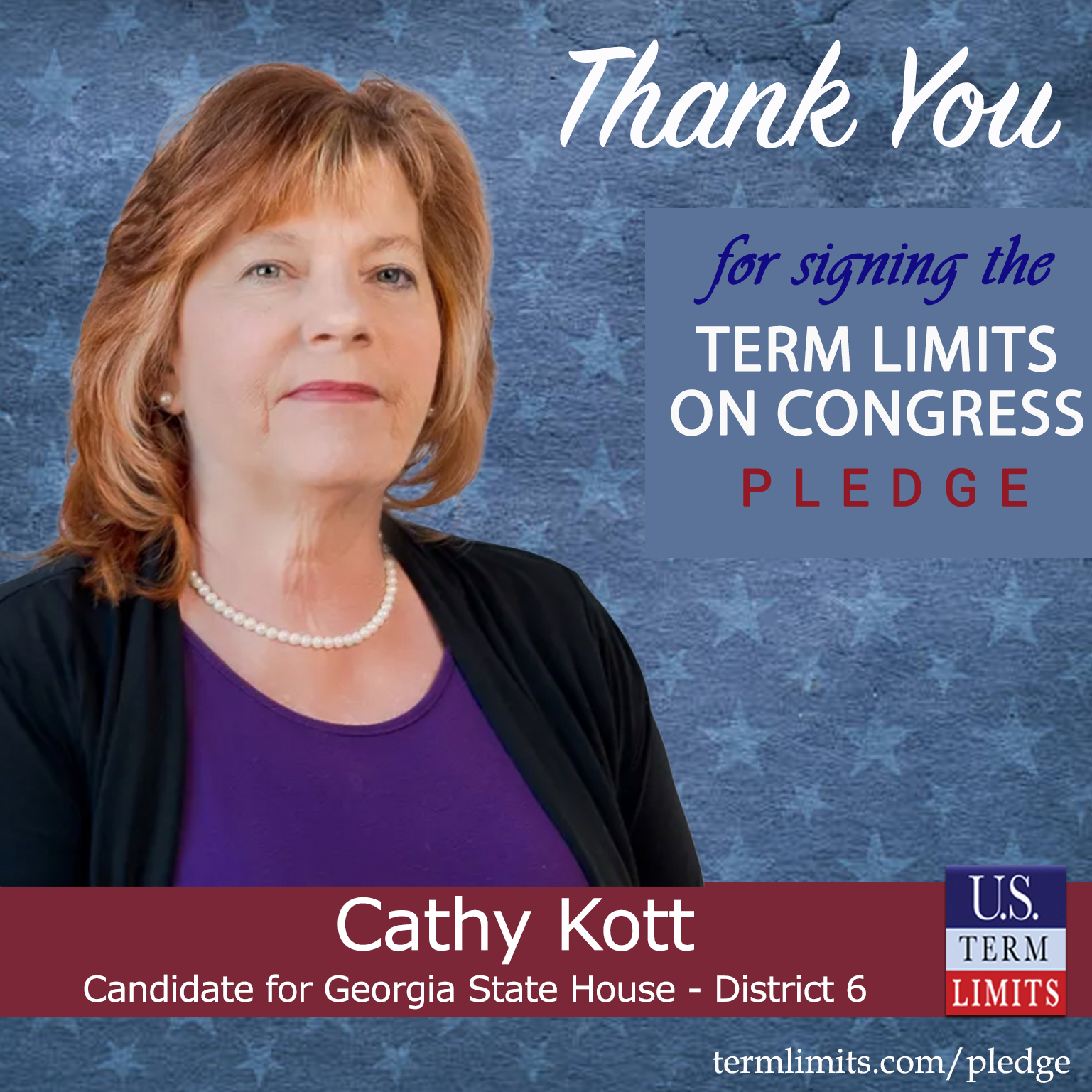 Chatsworth, GA – U.S. Term Limits (USTL), the leader in the national, non-partisan movement to limit terms for elected officials, is gathering support from state lawmakers across the nation. Its mission is to get 34 states to apply for an amendment proposal convention specific to term limits on Congress. Georgia state house candidate, Cathy Kott (District 6), has committed support for term limits on Congress by signing the term limits convention pledge. Previously, Rep. Jason Ridley also signed the pledge.