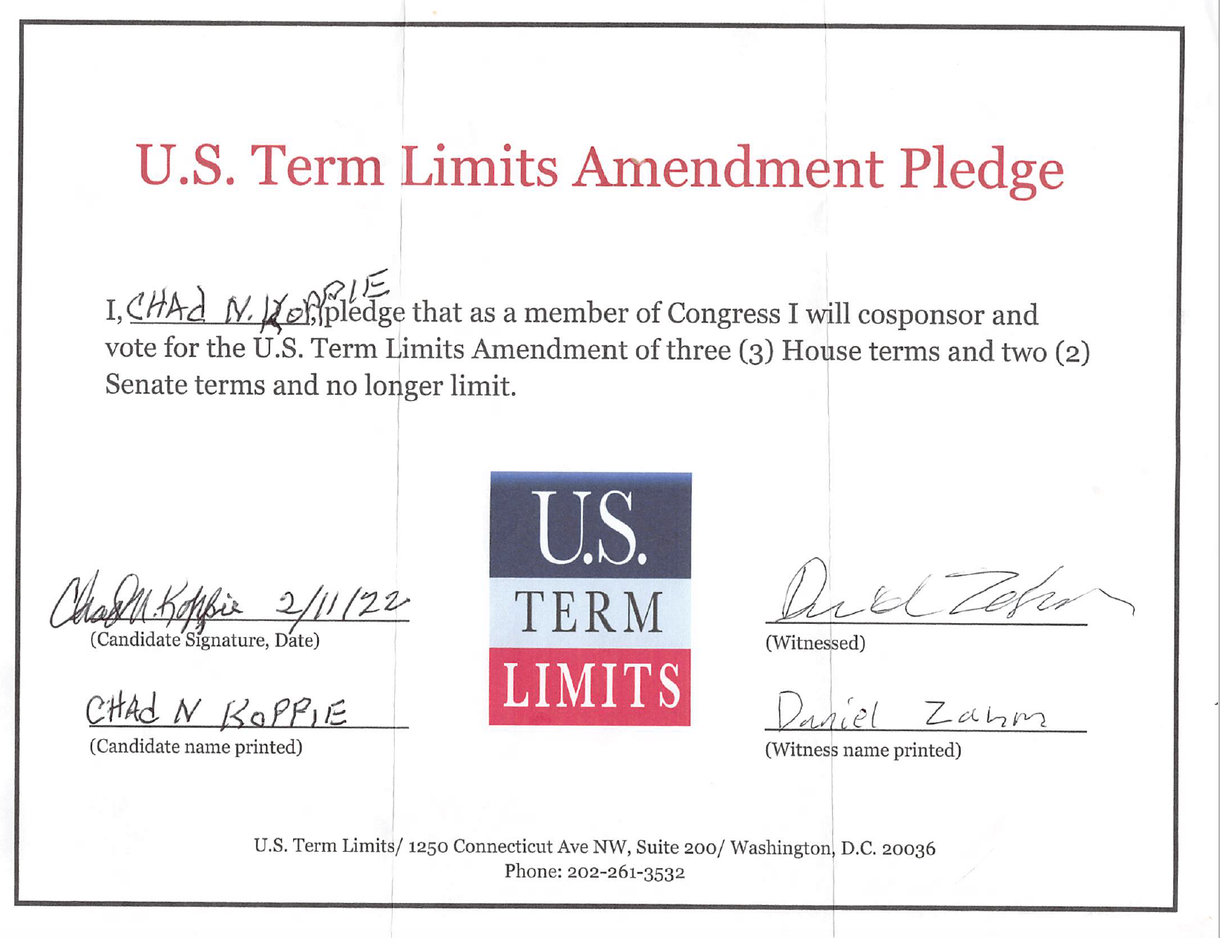 Washington D.C. – U.S. Term Limits (USTL), the leader in the non-partisan national movement to limit terms for elected officials, praises 2022 U.S. house candidate for Illinois, Chad Koppie (district 8), for signing the pledge for an amendment to term limit Congress. Previously, candidates Junaid Ahmed and Mohammed Faheem also signed the pledge.