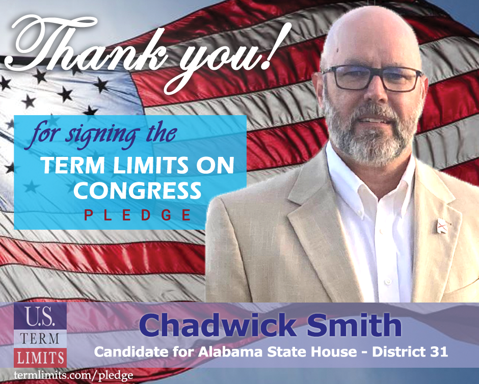 Montgomery, AL – U.S. Term Limits (USTL), the leader in the national, non-partisan movement to limit terms for elected officials, is gathering support from state lawmakers across the nation. Its mission is to get 34 states to apply for an amendment proposal convention specific to term limits on Congress. Alabama state house candidate, Chadwick Smith (district 31), has committed support for term limits on Congress by signing the U.S. Term Limits pledge.
