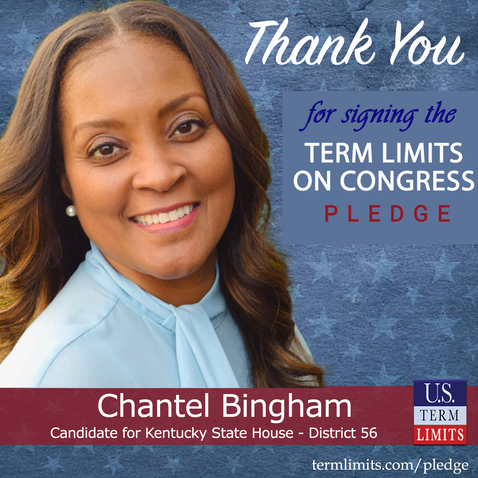 Frankfort, KY – U.S. Term Limits (USTL), the leader in the national, non-partisan movement to limit terms for elected officials, is gathering support from state lawmakers across the nation. Its mission is to get 34 states to apply for an amendment proposal convention specific to term limits on Congress. Kentucky state house candidate, Chantel Bingham (District 56), has committed support for term limits on Congress by signing the term limits convention pledge. Previously, candidate Miché Branscum also signed the pledge.