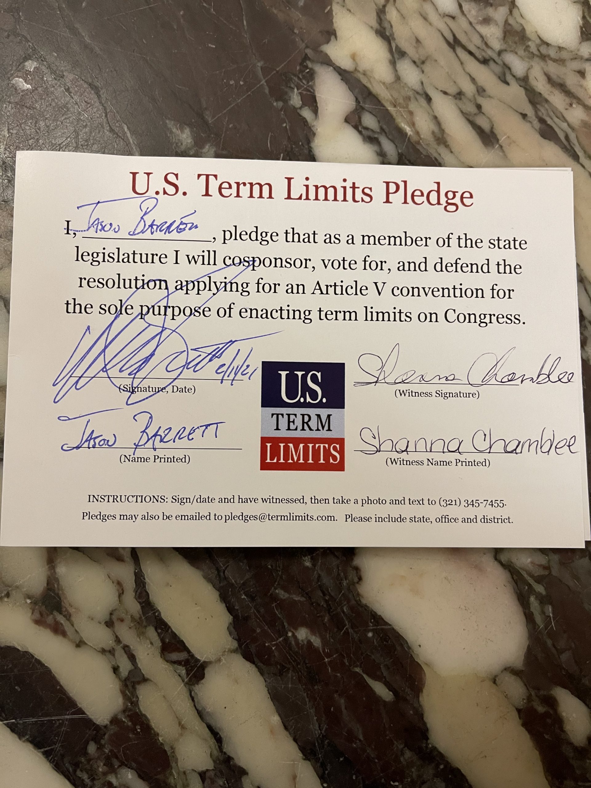 The U.S. Term Limits pledge is provided to candidates and members of state legislatures. It reads, “I pledge that, as a member of the state legislature, I will cosponsor, vote for, and defend the resolution applying for an Article V convention for the sole purpose of enacting term limits on Congress.”