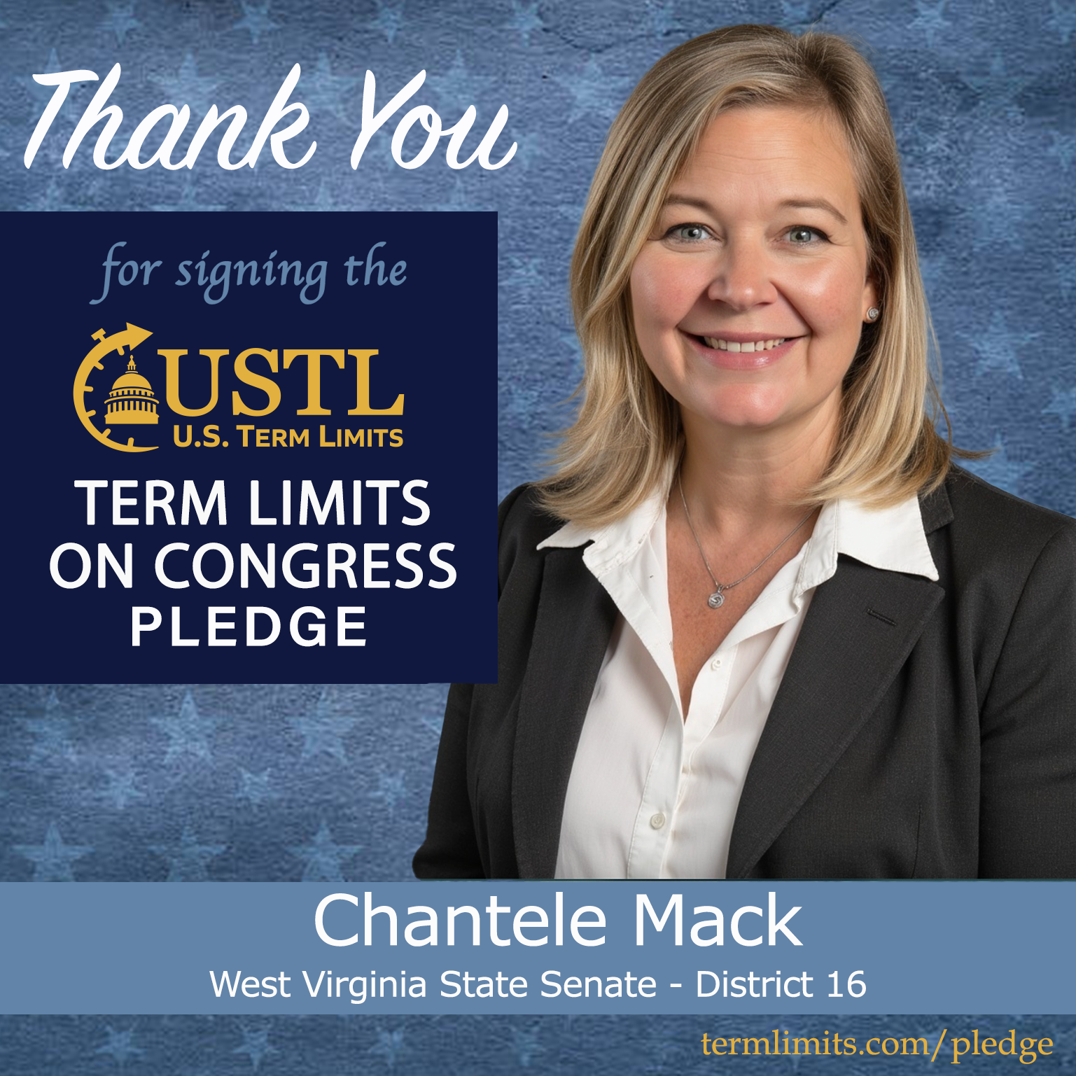Charles Town, WV – U.S. Term Limits (USTL), the leader in the national, non-partisan movement to limit terms for elected officials, is gathering support from state lawmakers across the nation. Its mission is to get 34 states to apply for an amendment proposal convention specific to term limits on Congress. 2026 West Virginia state senate candidate, Chantele Mack (district 16), has committed support for term limits on Congress by signing the term limits convention pledge. Previously, incumbent Delegate Jason Barrett also signed the pledge.