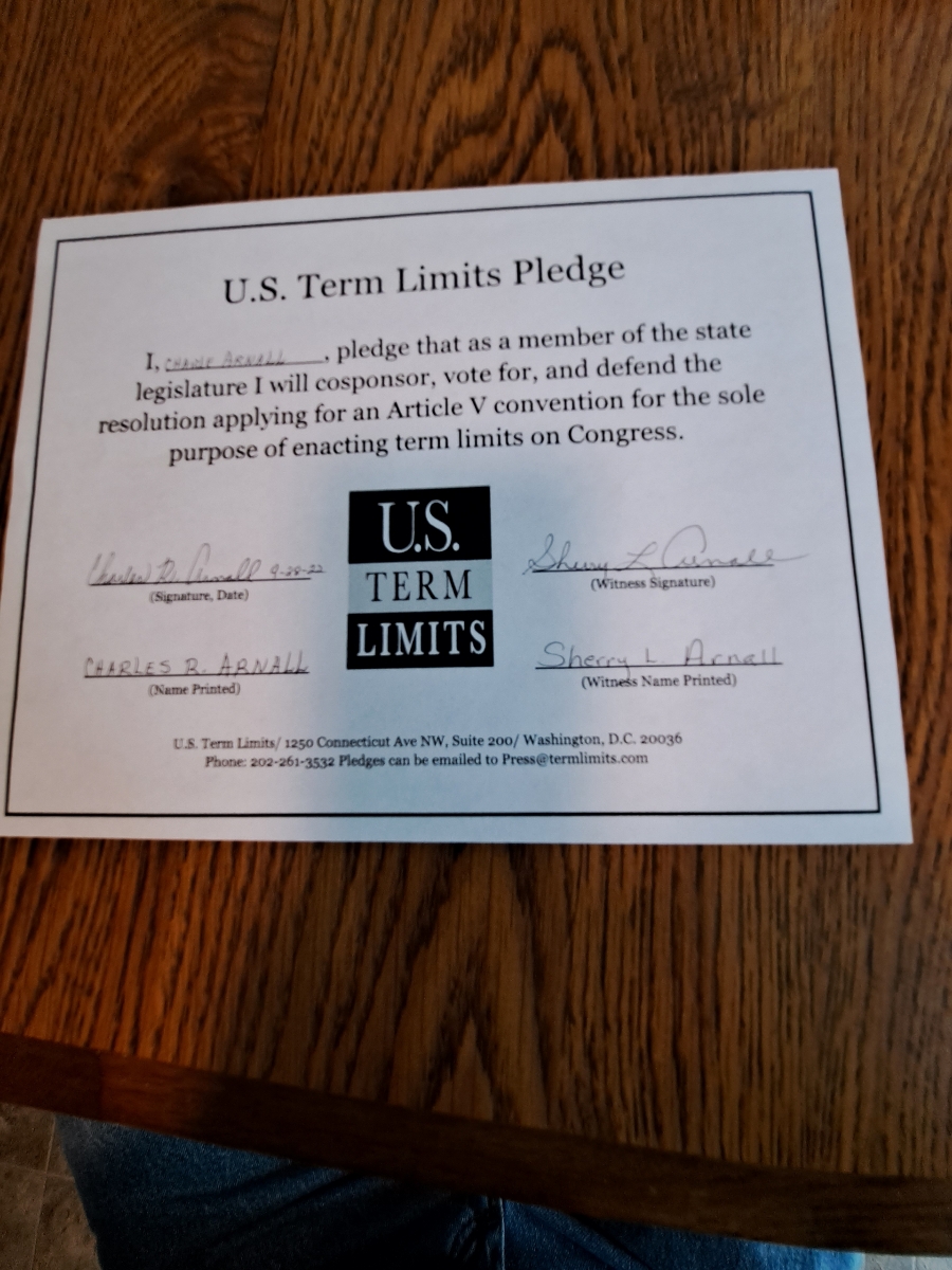 Talequah, OK – U.S. Term Limits (USTL), the leader in the national, non-partisan movement to limit terms for elected officials, is gathering support from state lawmakers across the nation. Its mission is to get 34 states to apply for an amendment proposal convention specific to term limits on Congress. Oklahoma state house candidate, Charles Arnall (district 4), has committed support for term limits on Congress by signing the Term Limits Convention pledge.