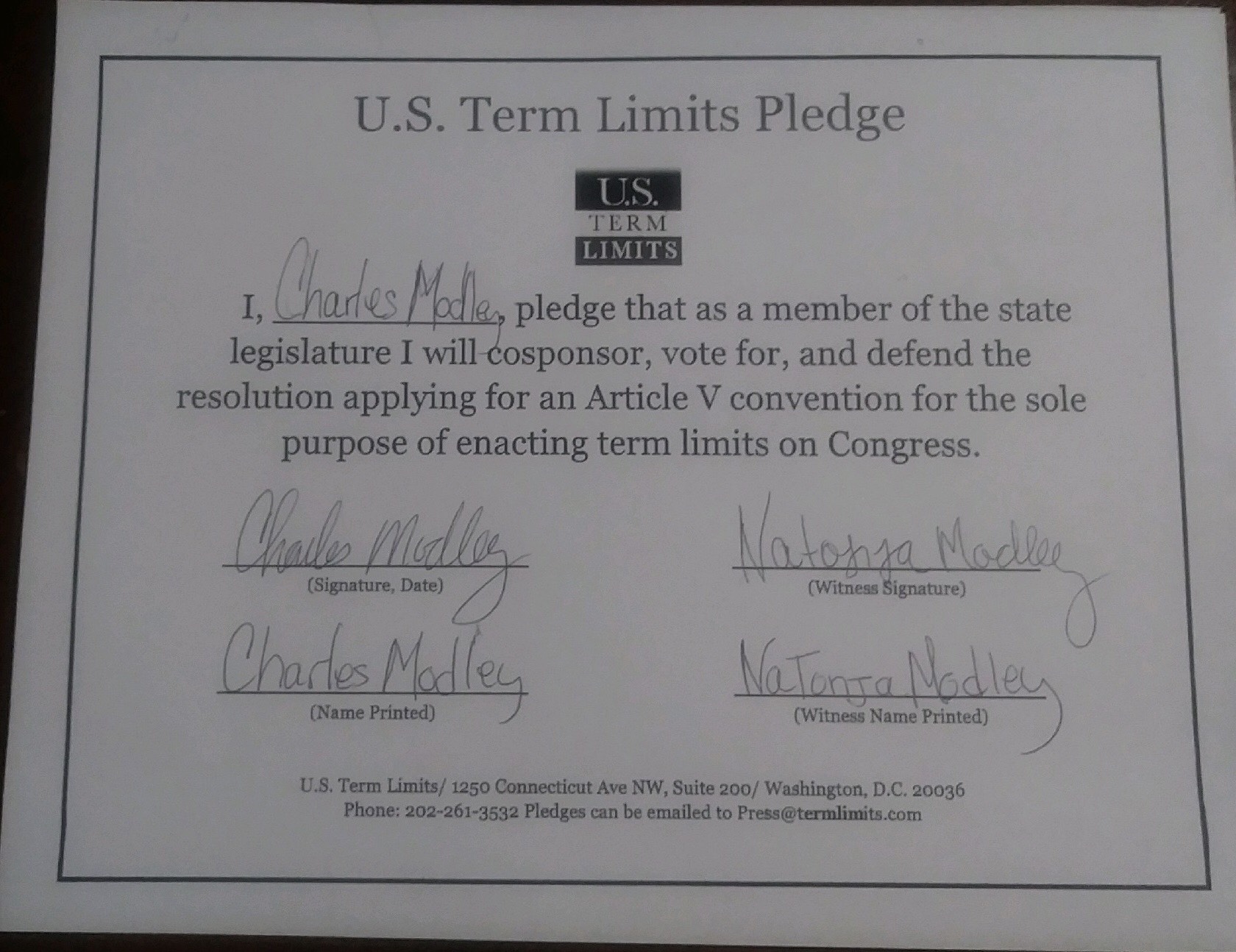 Charles Modley Pledges to Support Congressional Term Limits