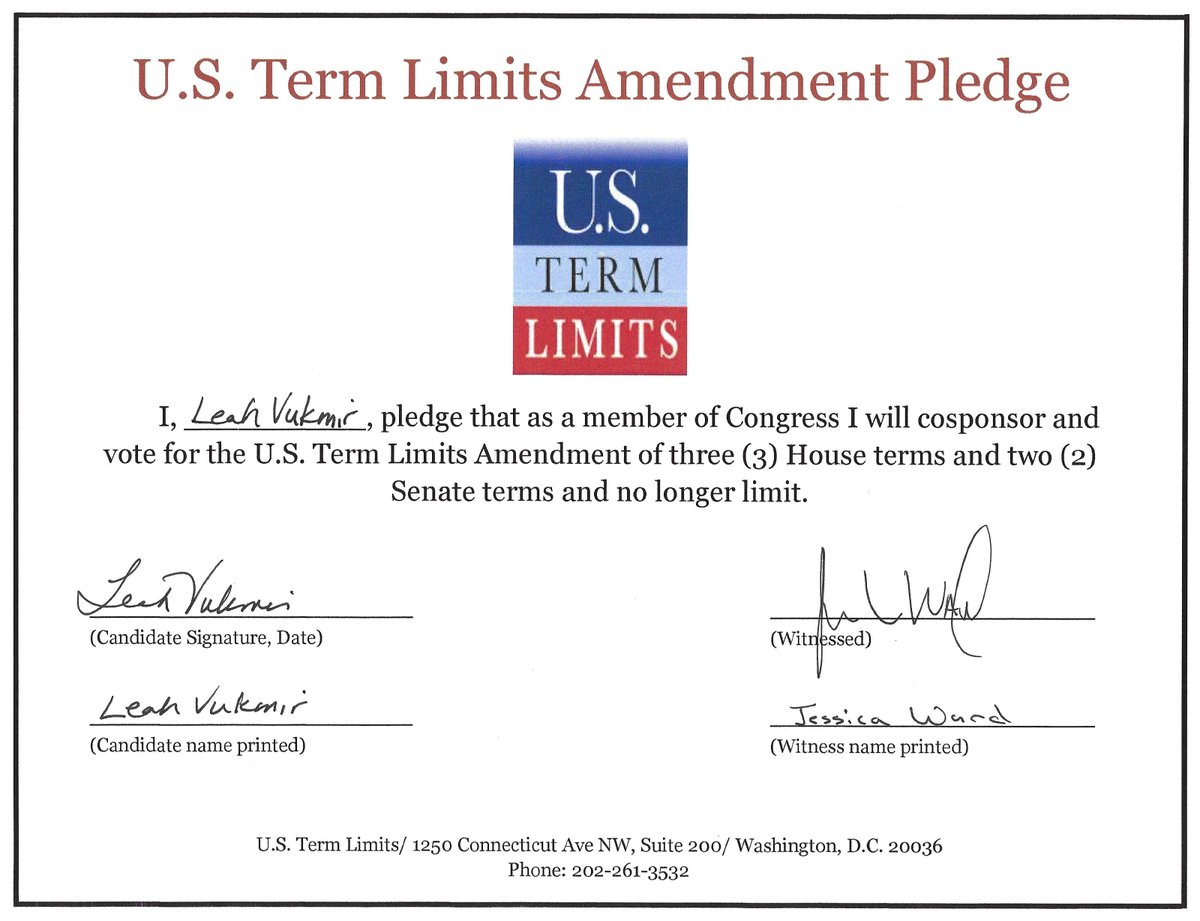 The U.S. Term Limits Amendment Pledge is provided to every announced candidate for federal office. It reads, “I pledge that as a member of Congress I will co-sponsor and vote for the U.S. Term Limits amendment of three (3) House terms and two (2) Senate terms and no longer limit.” The U.S. Term Limits Constitutional Amendment has been introduced in both the U.S. Senate by Senator Ted Cruz (SJR2) and the House of Representatives by Representative Ron DeSantis (HJR6).