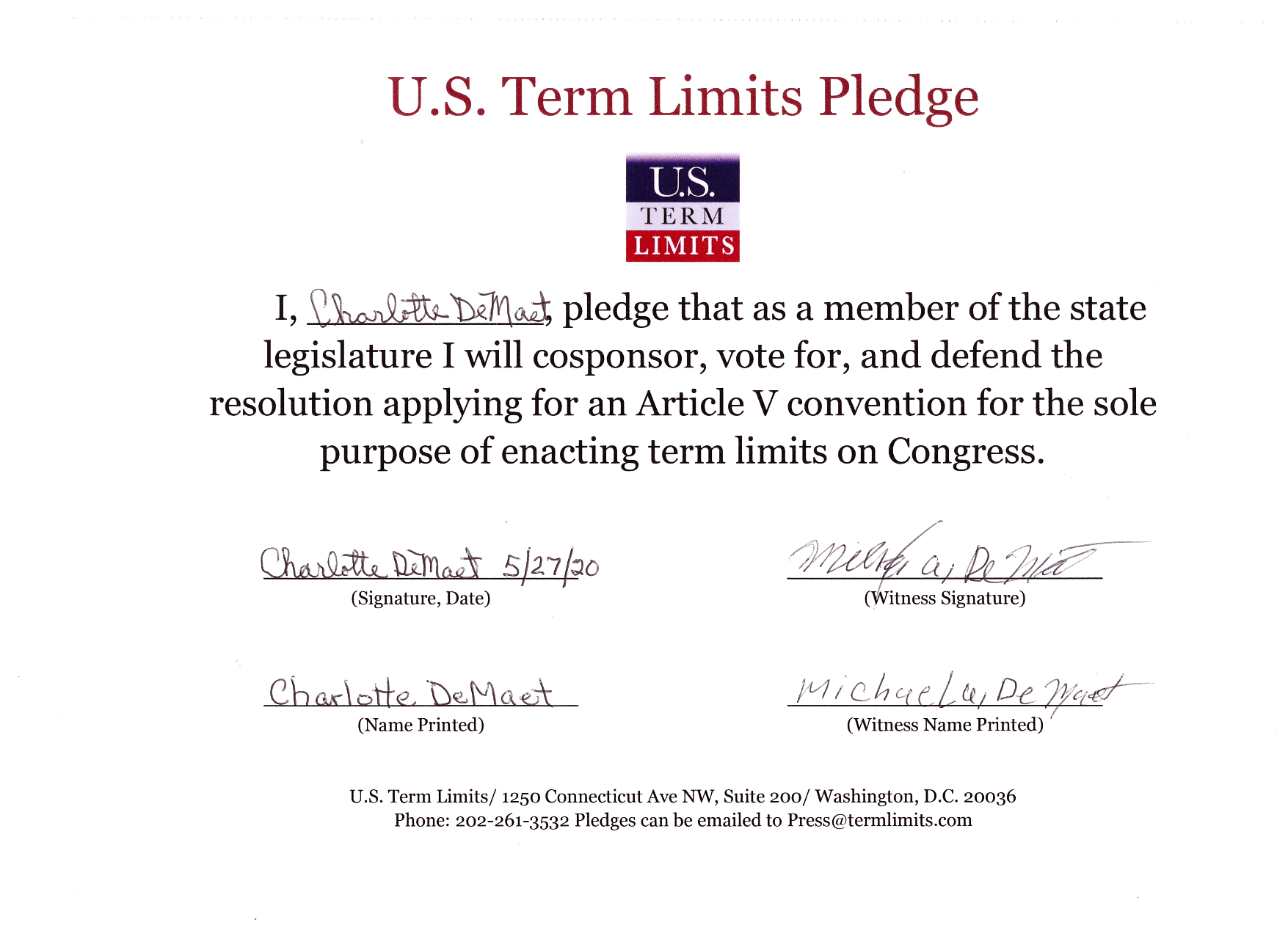 Charlotte DeMaet Pledges to Support Congressional Term Limits