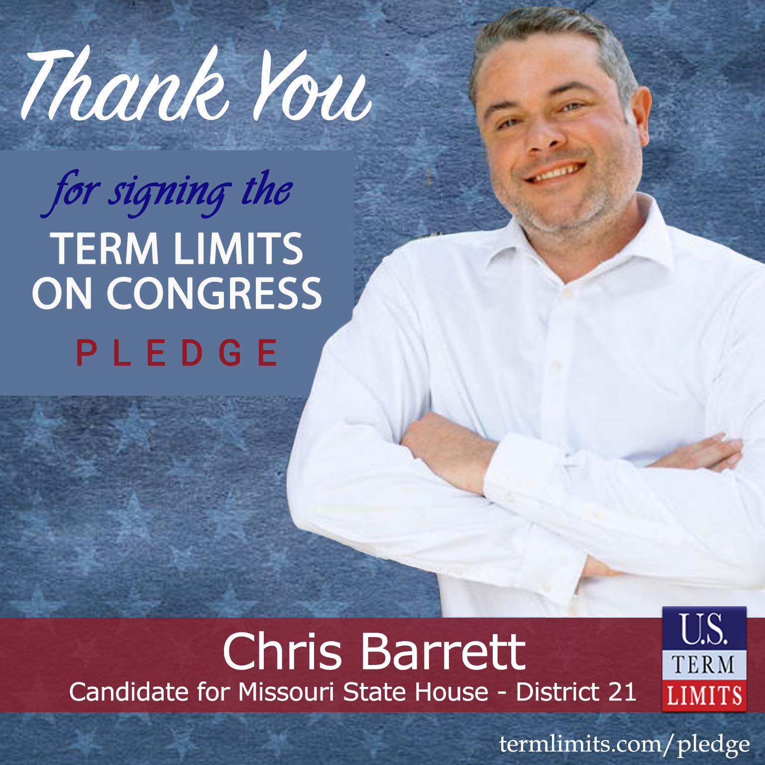 Independence, MO – U.S. Term Limits (USTL), the leader in the national, non-partisan movement to limit terms for elected officials, is gathering support from state lawmakers across the nation. Its mission is to get 34 states to apply for an amendment proposal convention specific to term limits on Congress. 2026 Missouri state house candidate, Chris Barrett (district 21), has committed support for term limits on Congress by signing the term limits convention pledge. Barrett is the first signer in this race.