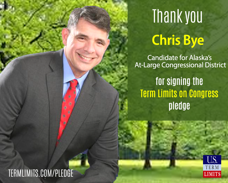 Washington D.C. – U.S. Term Limits (USTL), the leader in the non-partisan national movement to limit terms for elected officials, praises 2022 U.S. house candidate for Alaska, Chris Bye (At-Large district), for signing the pledge for an amendment to term limit Congress. Previously, candidates Silvio Pellegrini, Bob Lyons and Randy Purham also signed the pledge.