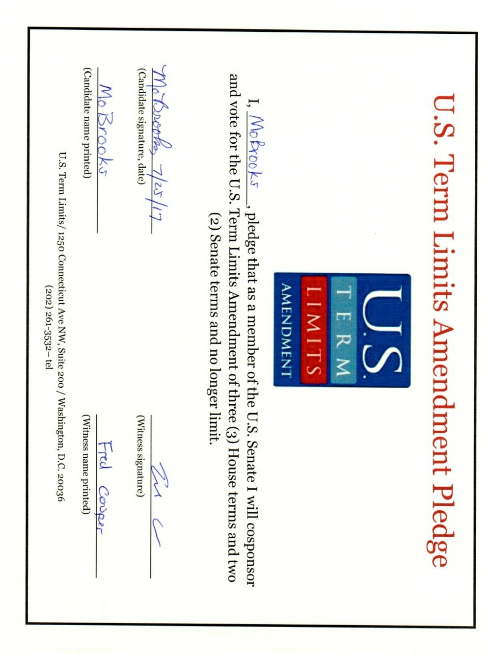 The U.S. Term Limits amendment pledge is provided to every announced candidate for federal office. It reads, “I pledge that as a member of Congress, I will cosponsor and vote for the U.S. Term Limits amendment of three (3) House terms and two (2) Senate terms and no longer limit.” The U.S. Term Limits constitutional amendment has been introduced in both the U.S. Senate by Senator Ted Cruz (SJR1) and the U.S. House by Representative Francis Rooney (HJR20).