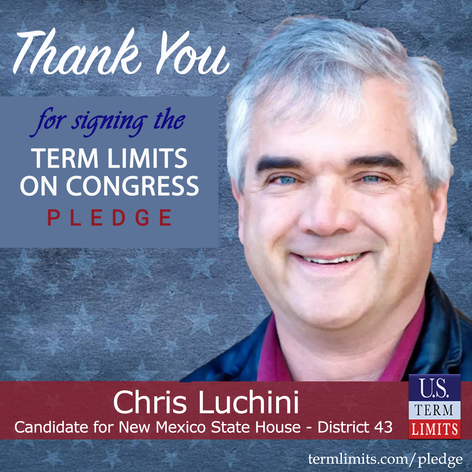 Los Alamos, NM – U.S. Term Limits (USTL), the leader in the national, non-partisan movement to limit terms for elected officials, is gathering support from state lawmakers across the nation. Its mission is to get 34 states to apply for an amendment proposal convention specific to term limits on Congress. New Mexico state house candidate, Chris Luchini (District 43), has committed support for term limits on Congress by signing the Term Limits Convention Pledge. Luchini is the first signer in this race.