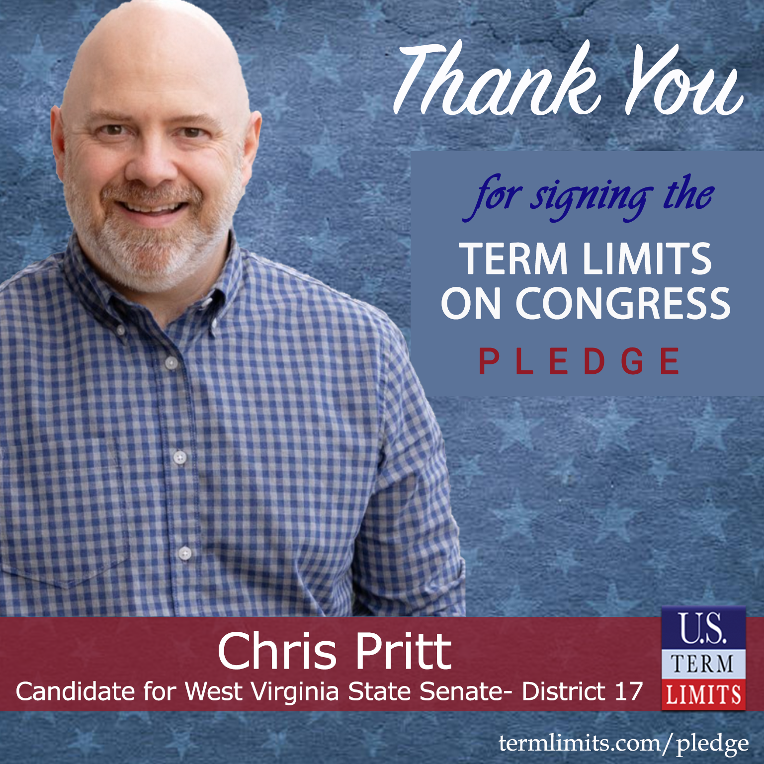 Charleston, WV – U.S. Term Limits (USTL), the leader in the national, non-partisan movement to limit terms for elected officials, is gathering support from state lawmakers across the nation. Its mission is to get 34 states to apply for an amendment proposal convention specific to term limits on Congress. West Virginia state senate candidate, Chris Pritt (District 17), has committed support for term limits on Congress by signing the term limits convention pledge.
