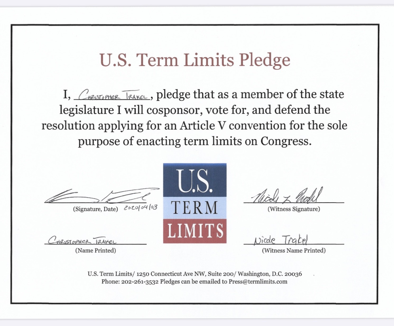 USTL President, Philip Blumel, commented on Trakel’s pledge saying, “Chris’s support of term limits shows that there are individuals who are willing to listen to the majority of voters who want term limits. America needs a Congress that will be served by citizen legislators, not career politicians.”