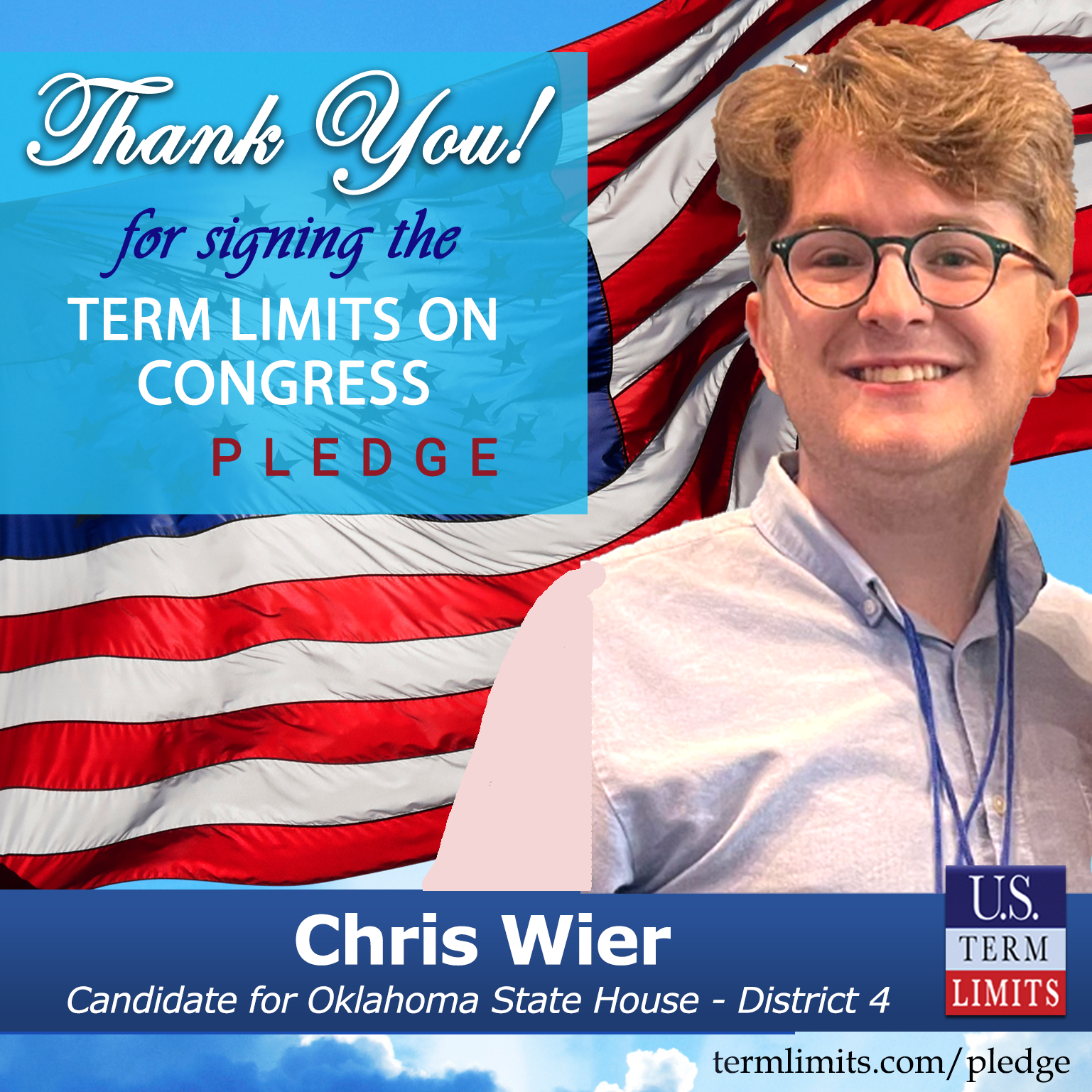 Tahlequah, OK – U.S. Term Limits (USTL), the leader in the national, non-partisan movement to limit terms for elected officials, is gathering support from state lawmakers across the nation. Its mission is to get 34 states to apply for an amendment proposal convention specific to term limits on Congress. Oklahoma state house candidate, Chris Wier (District 4), has committed support for term limits on Congress by signing the term limits convention pledge. Wier is the first signer in this race.
