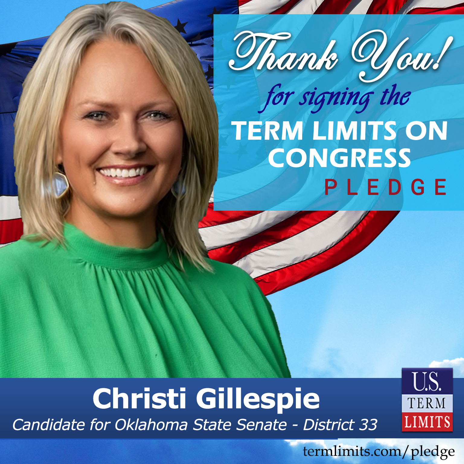 Broken Arrow, OK – U.S. Term Limits (USTL), the leader in the national, non-partisan movement to limit terms for elected officials, is gathering support from state lawmakers across the nation. Its mission is to get 34 states to apply for an amendment proposal convention specific to term limits on Congress. Oklahoma state senate candidate, Christie Gillespie (District 33), has committed support for term limits on Congress by signing the Term Limits Convention pledge. Previously, candidate Shelley Gwartney also signed the pledge in this race.