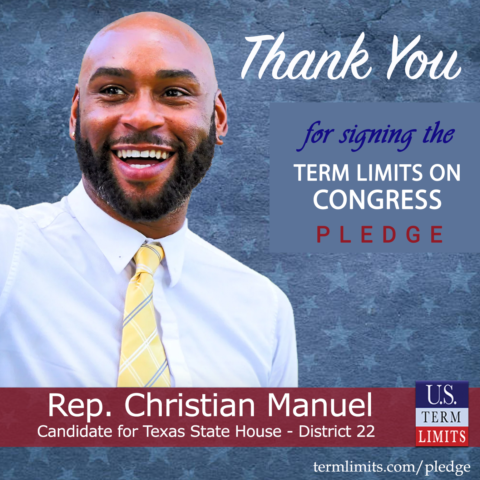 USTL President, Philip Blumel, commented on Manuel’s pledge saying, “Christian’s strong support of term limits shows that there are individuals who are willing to listen to the majority of voters who want term limits. America needs a Congress that will be served by citizen legislators, not career politicians.”