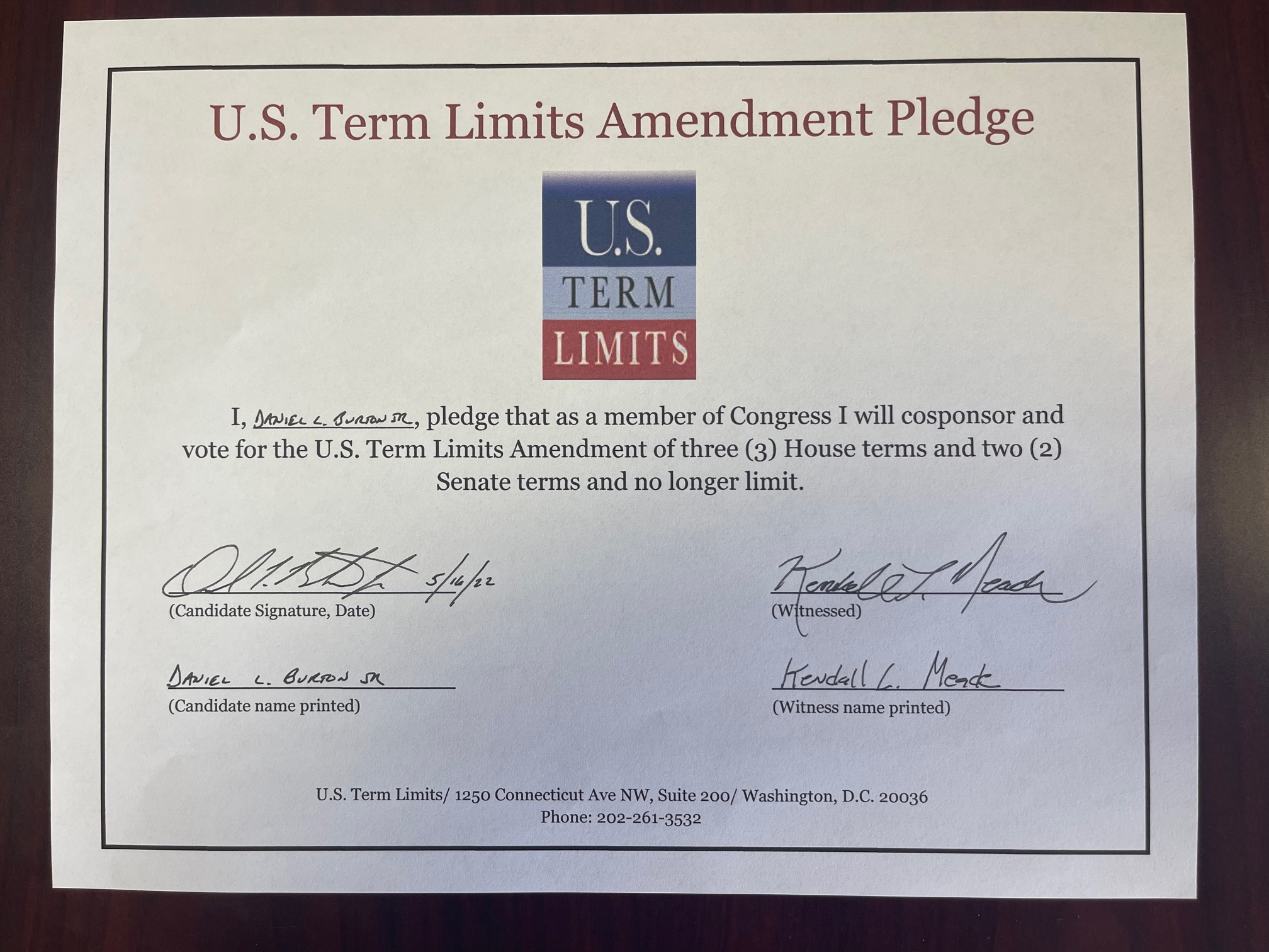 The U.S. Term Limits amendment pledge is provided to every announced candidate for federal office. It reads, “I pledge that as a member of Congress, I will cosponsor and vote for the U.S. Term Limits amendment of three (3) House terms and two (2) Senate terms and no longer limit.” The U.S. Term Limits constitutional amendment has been introduced in both the U.S. Senate by Senator Ted Cruz and his colleagues (SJR3) and the U.S. House by Representative Ralph Norman (HJR12).