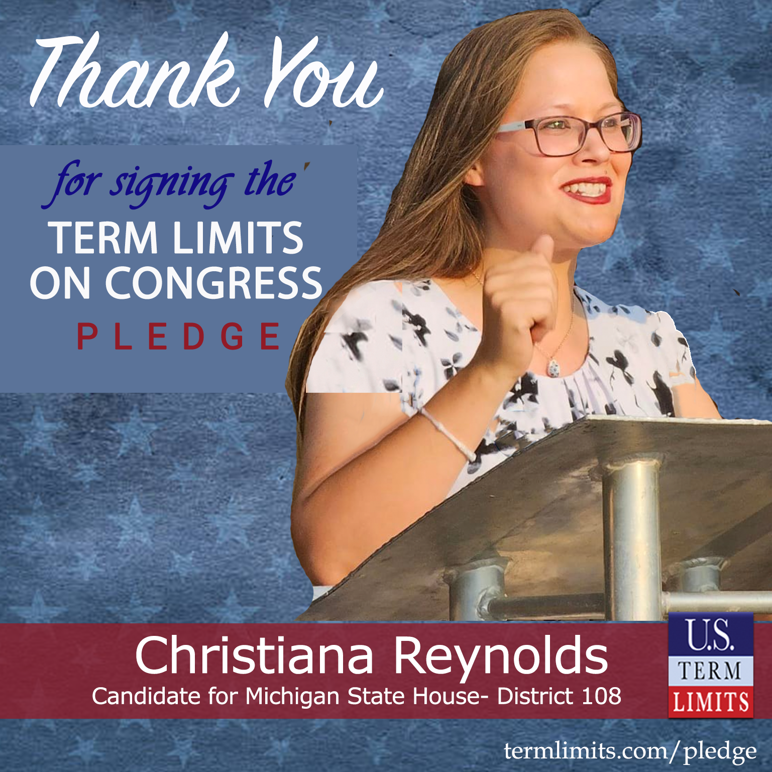 USTL President, Philip Blumel, commented on Reynolds’s pledge saying, “Christiana’s strong support of term limits shows that there are individuals who are willing to listen to the majority of voters who want term limits. America needs a Congress that will be served by citizen legislators, not career politicians.”