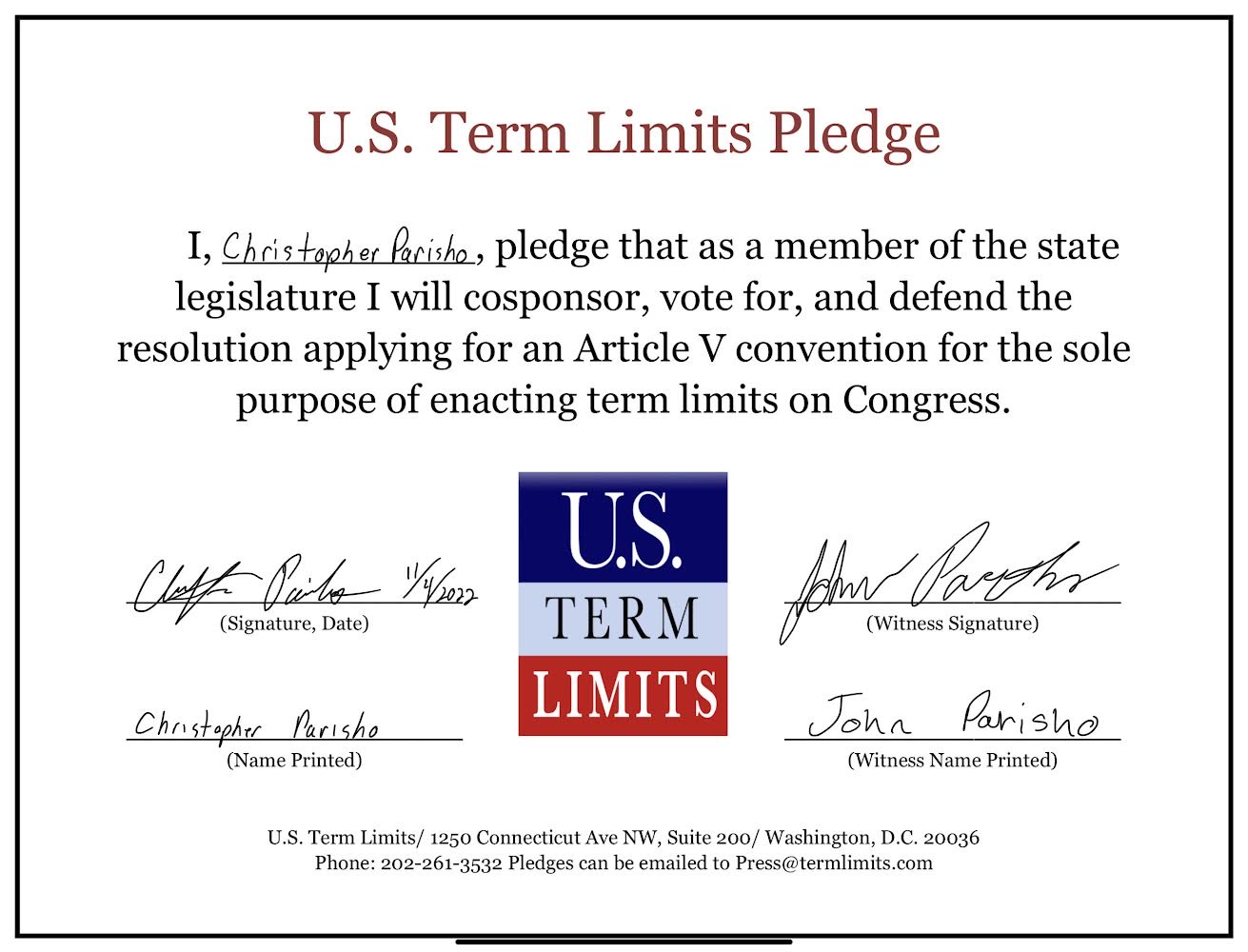 USTL President, Philip Blumel, commented on Parisho’s pledge saying, “Christopher’s support of term limits shows that there are individuals who are willing to listen to the majority of voters who want term limits. America needs a Congress that will be served by citizen legislators, not career politicians.”