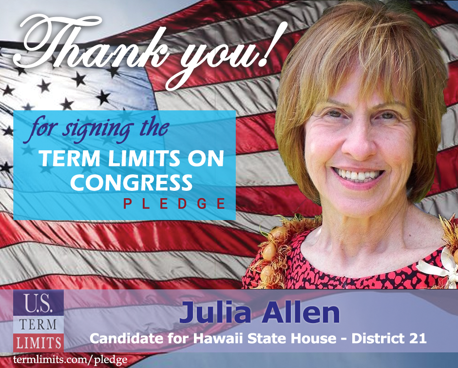 The U.S. Term Limits pledge is provided to candidates and members of state legislatures. It reads, “I pledge that, as a member of the state legislature, I will cosponsor, vote for, and defend the resolution applying for an Article V convention for the limited purpose of enacting term limits on Congress.”