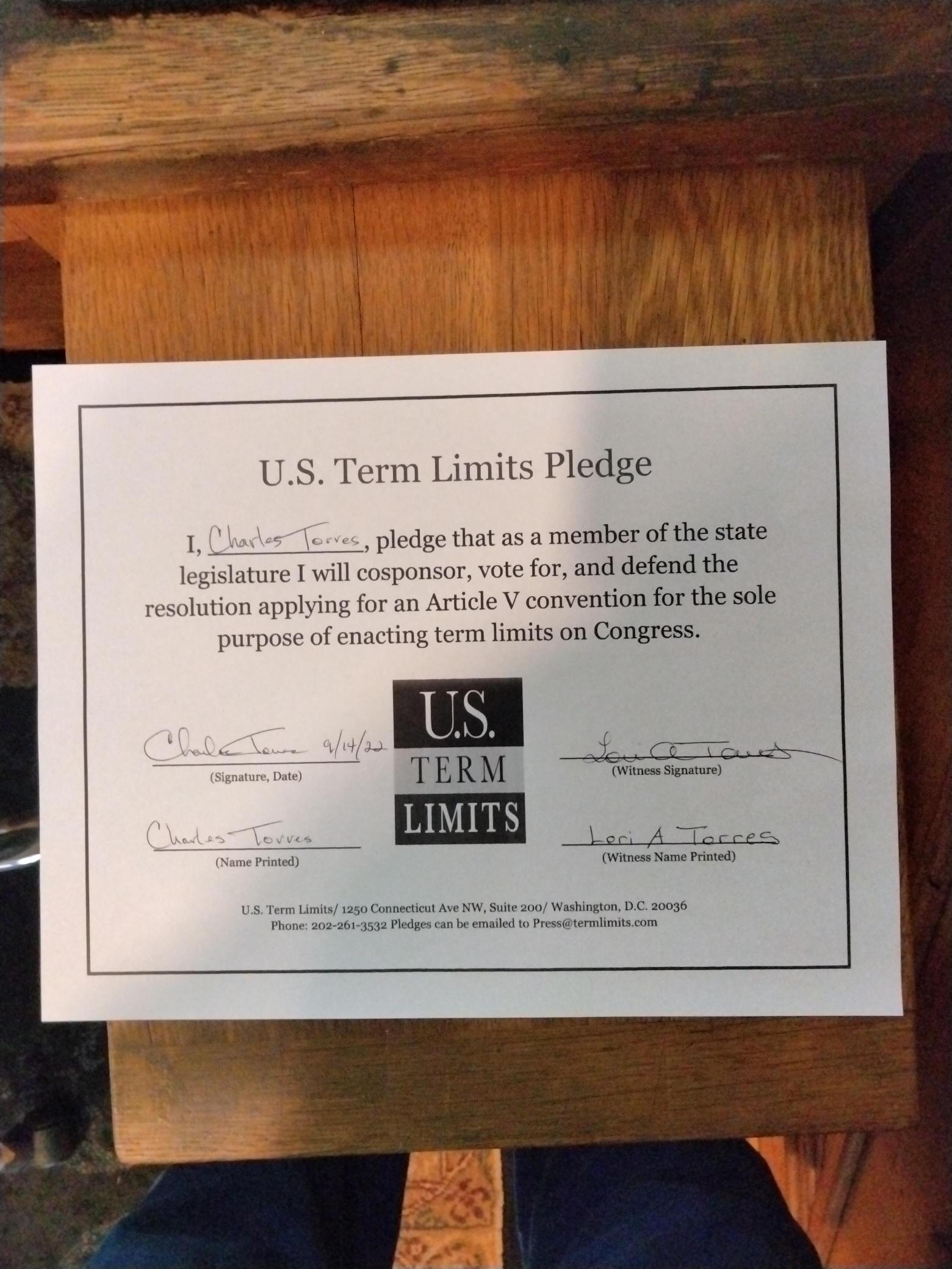USTL President, Philip Blumel, commented on Torres’s pledge saying, “Chuck’s support of term limits shows that there are individuals who are willing to listen to the majority of voters who want term limits. America needs a Congress that will be served by citizen legislators, not career politicians.”
