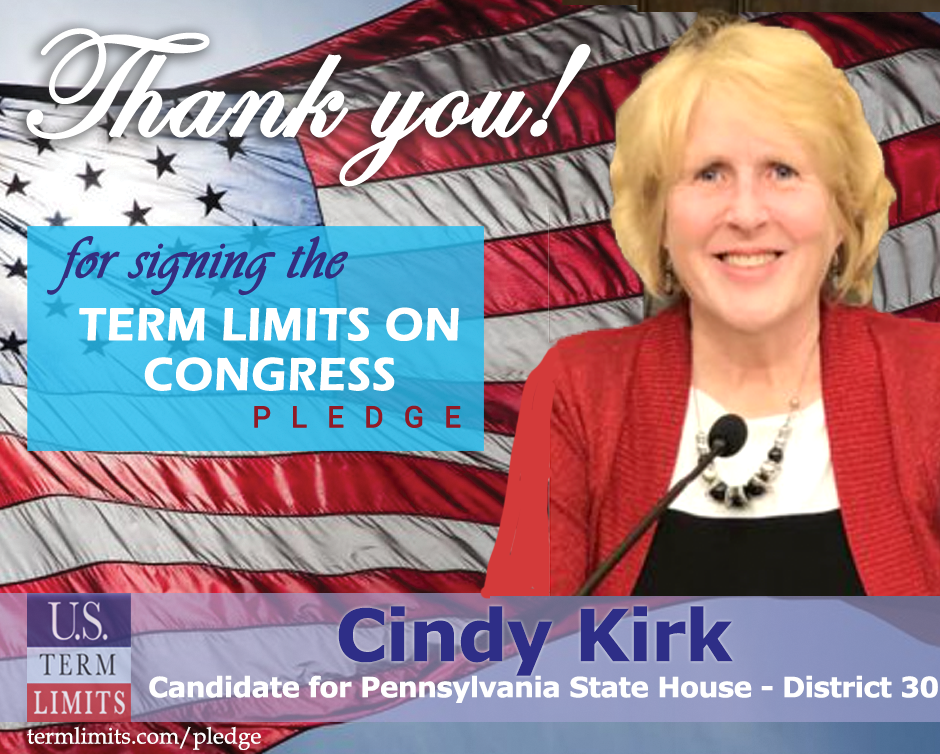 Pittsburgh, PA – U.S. Term Limits (USTL), the leader in the national, non-partisan movement to limit terms for elected officials, is gathering support from state lawmakers across the nation. Its mission is to get 34 states to apply for an amendment proposal convention specific to term limits on Congress. Pennsylvania state house candidate, Cindy Kirk (district 30), has committed support for term limits on Congress by signing the U.S. Term Limits pledge. Kirk is the first signer in this race.