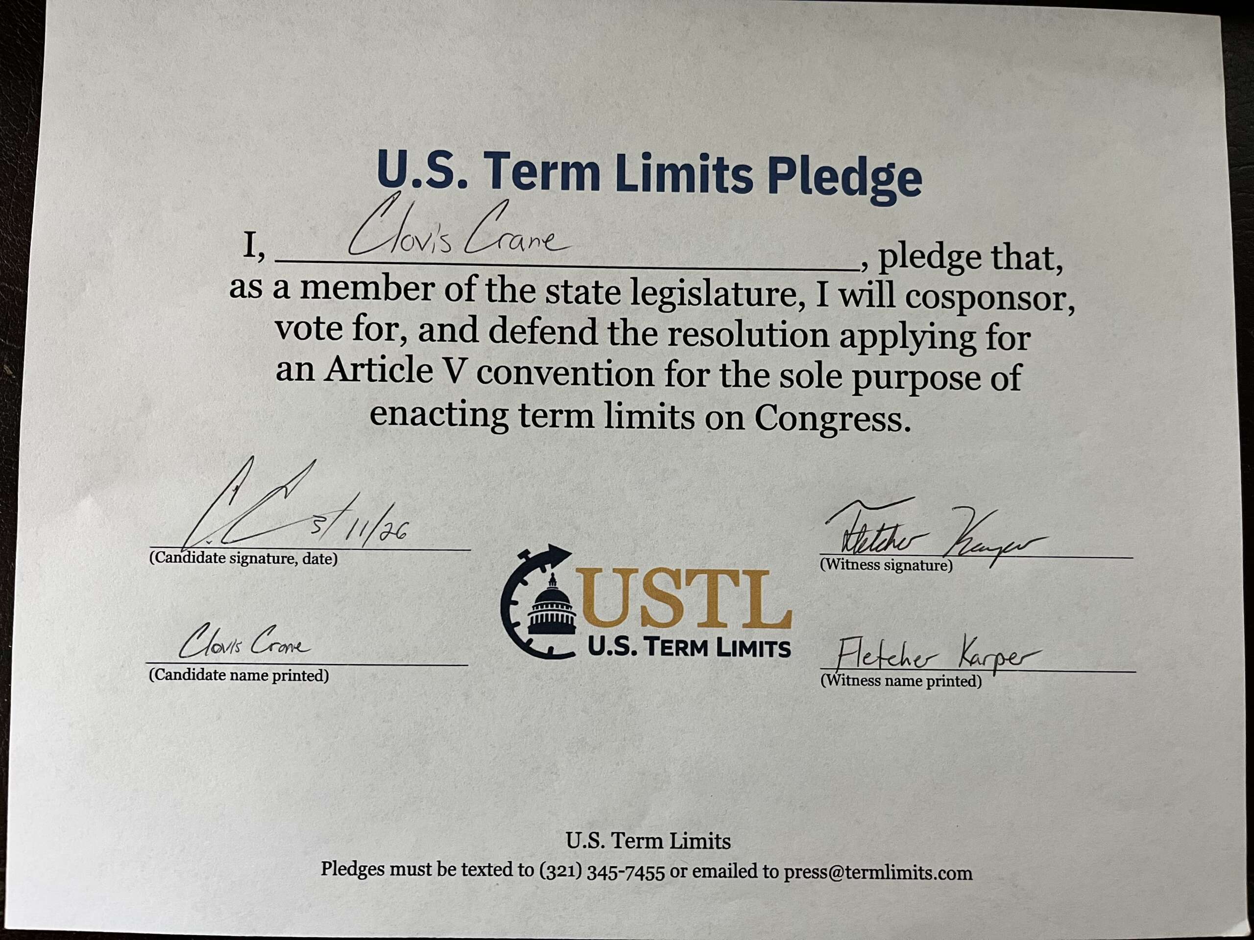Clovis Crane Pledges to Support Congressional Term Limits